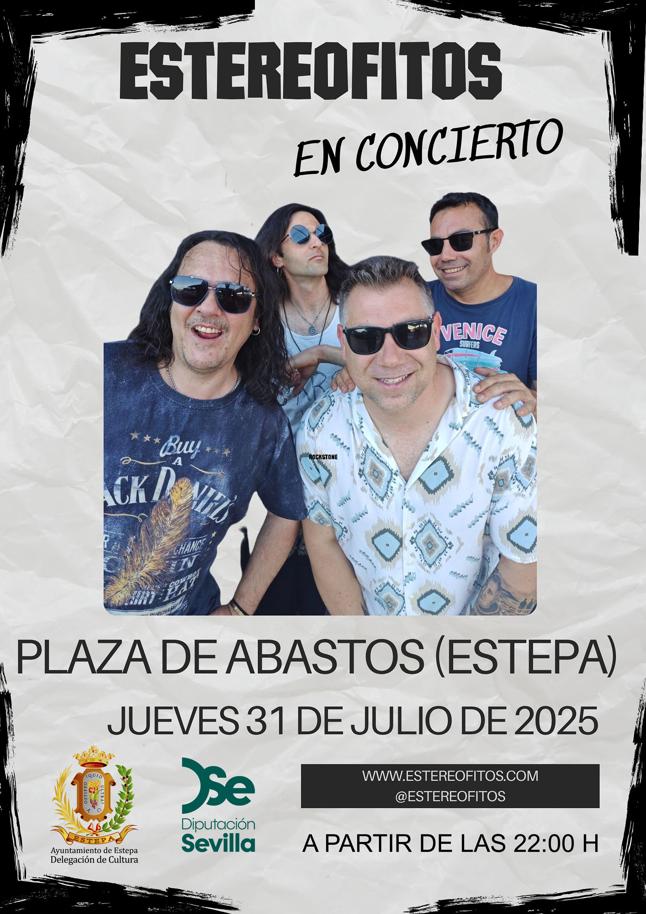 Como colofón del mes de julio, la Delegación de Cultura os ofrece un concierto con el grupo ESTEREOFITOS, quienes traen un repertorio enmarcado en los géneros pop-rock y rock alternativo, incluyendo temas originales y versiones de artistas ampliamente reconocidos del panorama musical español, como Fito&Fitipaldis y Héroes del Silencio.