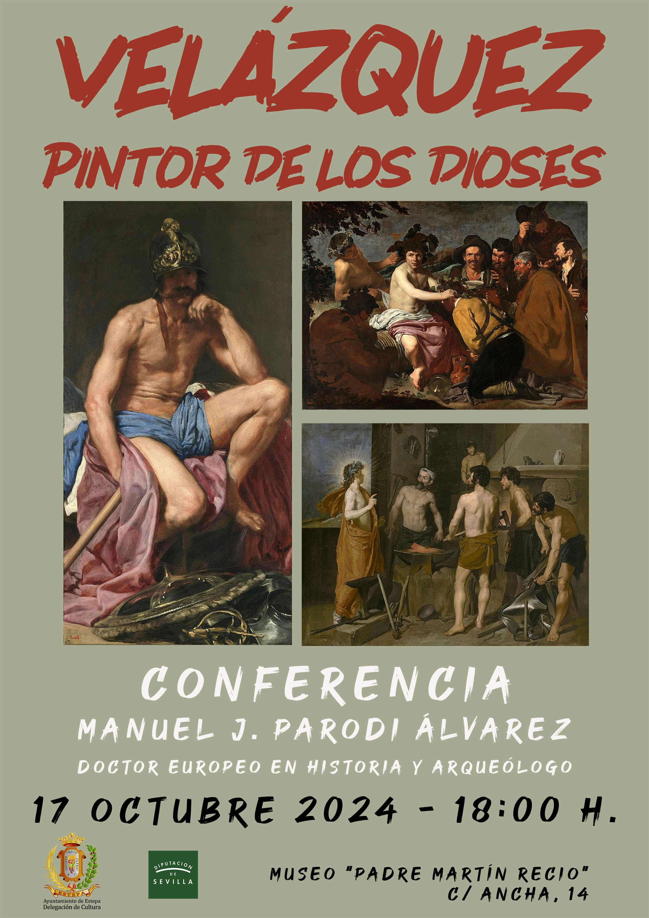 Claustro Bajo del Museo Padre Martín Recio. III Campaña de Arte La Delegación de Cultura y la Diputación de Sevilla nos trae una conferencia sobre la mitología ilustrada por el pintor sevillano Diego de Silva y Velázquez (1599 – 1660), como conmemoración a los 425 años de su nacimiento.