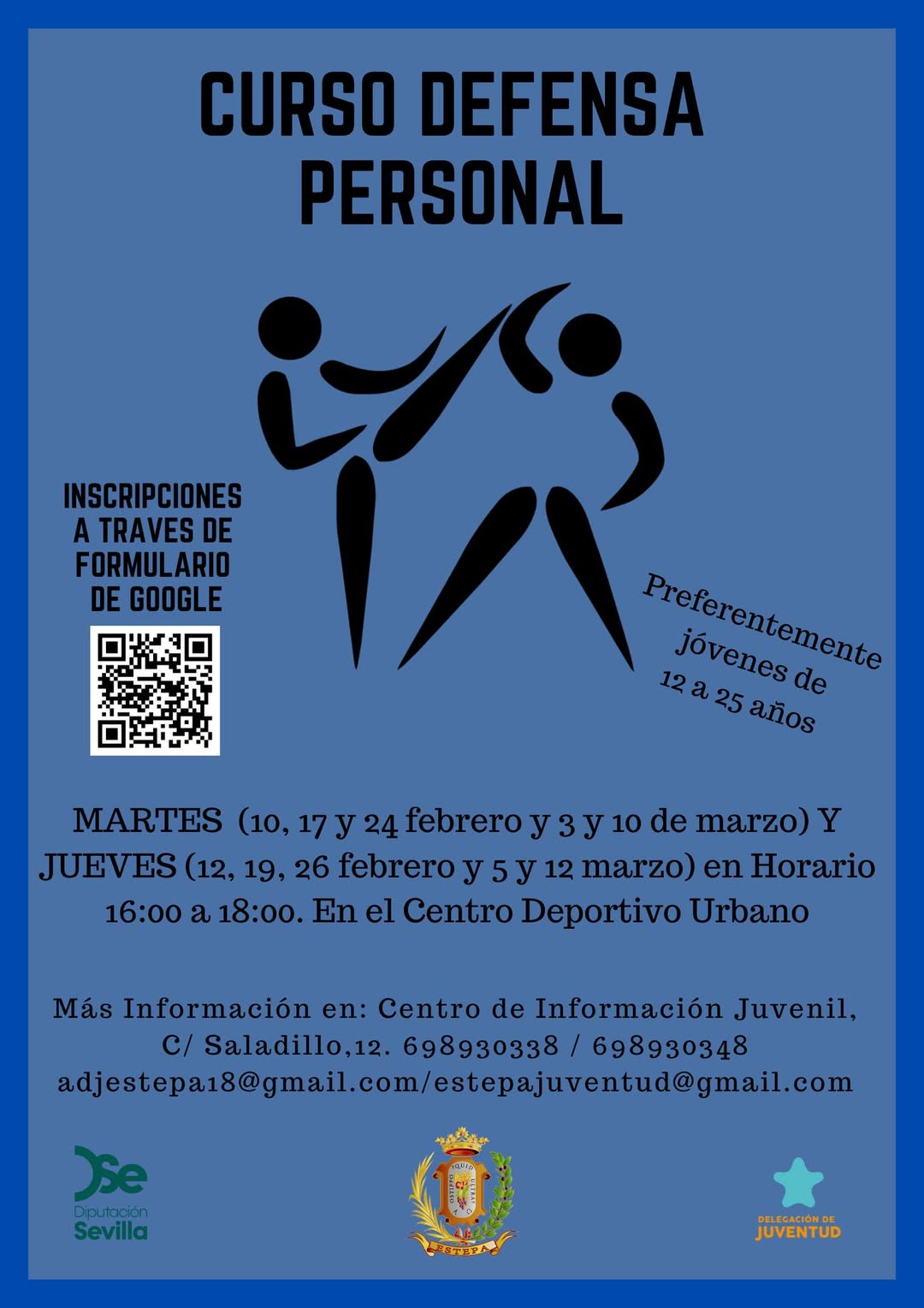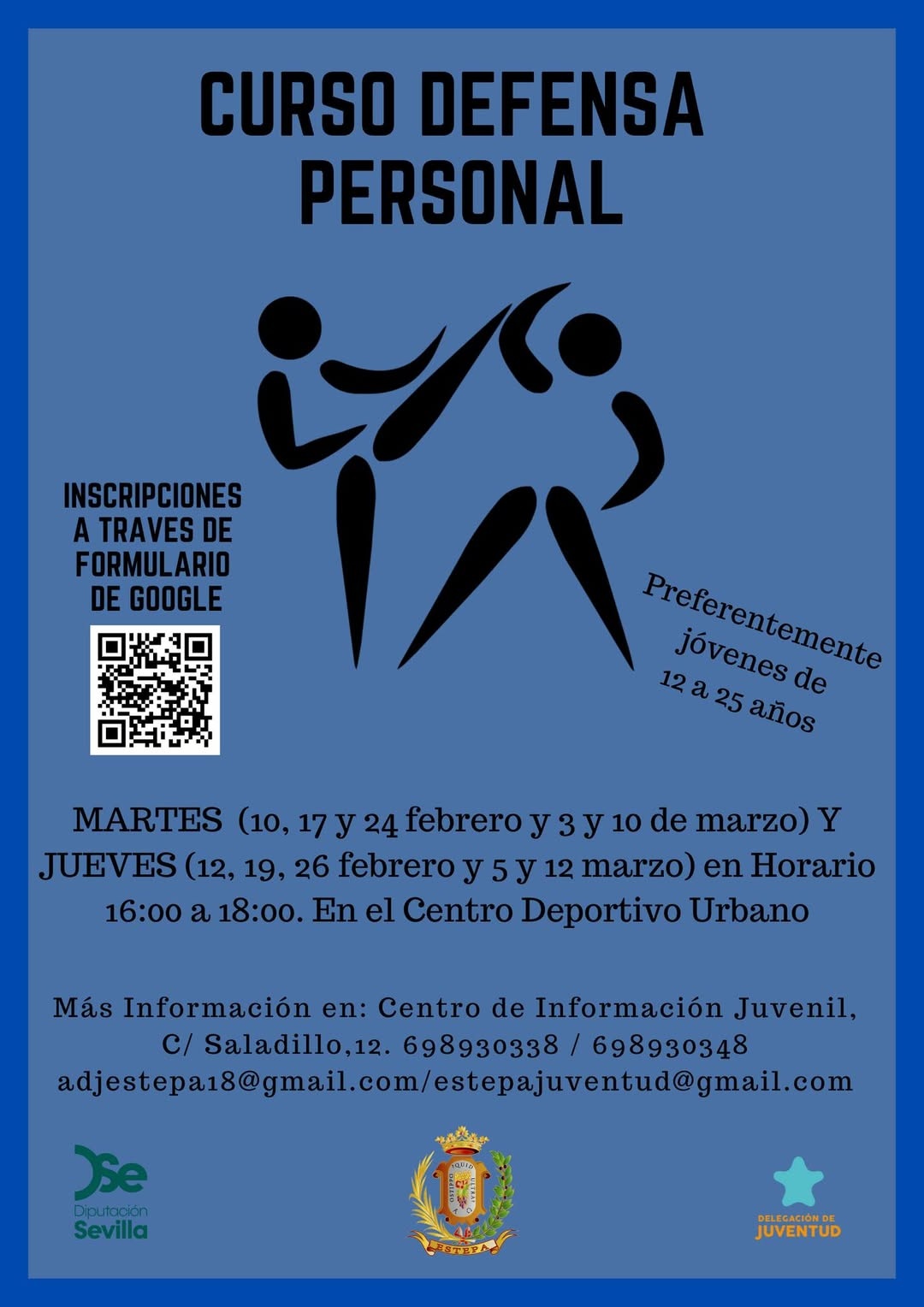 La Delegación de Juventud presenta este curso dentro del Proyecto Local Estepa Crea, subvencionado por la Diputación de Sevilla, ¡destinado a jóvenes interesados en aprender técnicas de defensa y mejorar la confianza y seguridad en uno mismo!