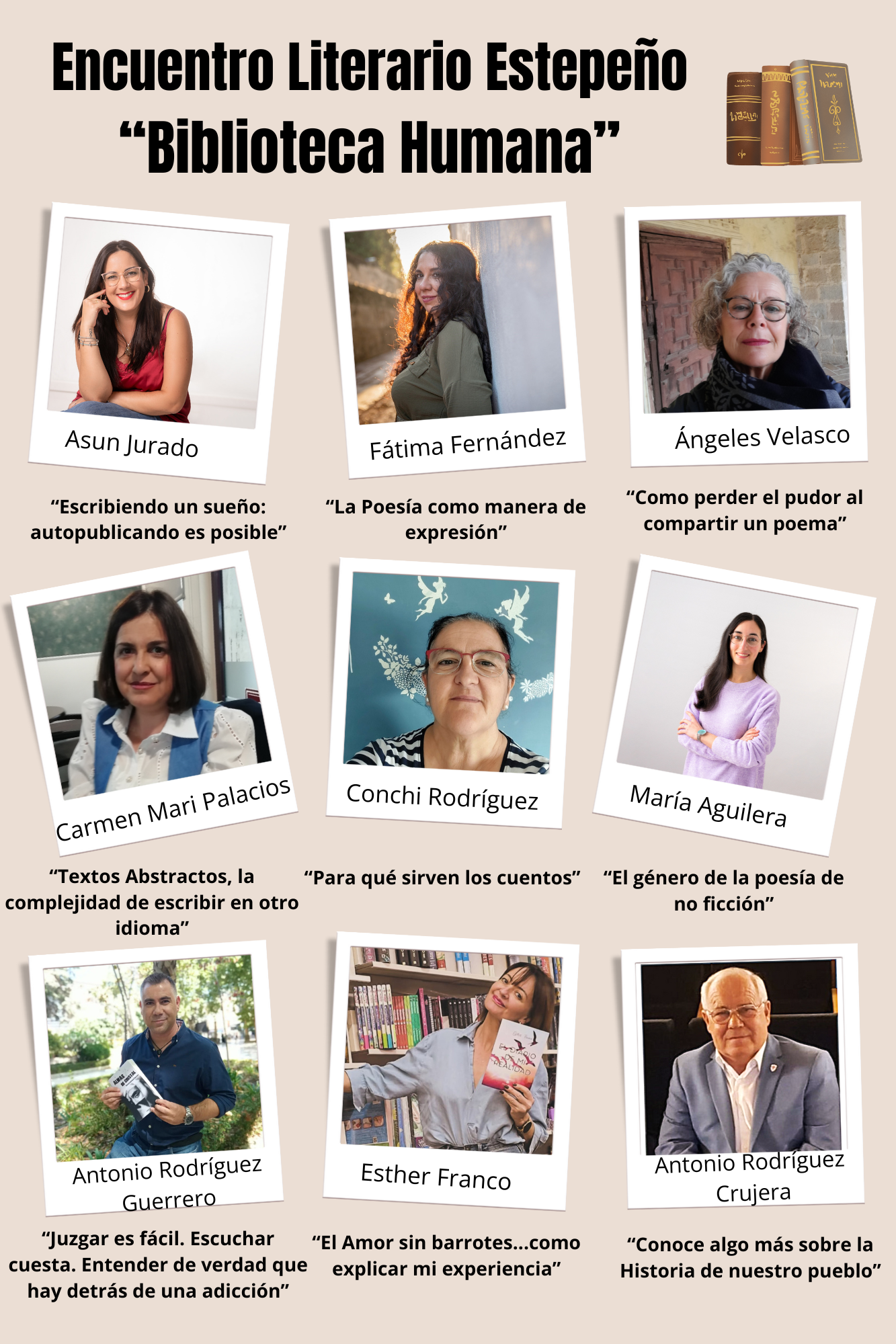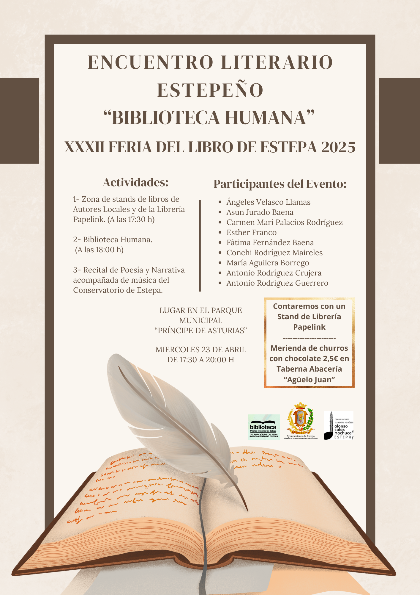 Este año, coincidiendo con el “Día Internacional del Libro”, como novedad, realizaremos una actividad al aire libre: Encuentro Literario Estepeño - “Biblioteca Humana”, en el Parque Municipal “Principe de Asturias” de Estepa, a partir de las 17:30h. En dicha actividad contaremos con escritores/as de nuestra ciudad y con la Librería Papelink, además de poder merendar en la Taberna Abacería “Agüelo Juan”, frente al parque.