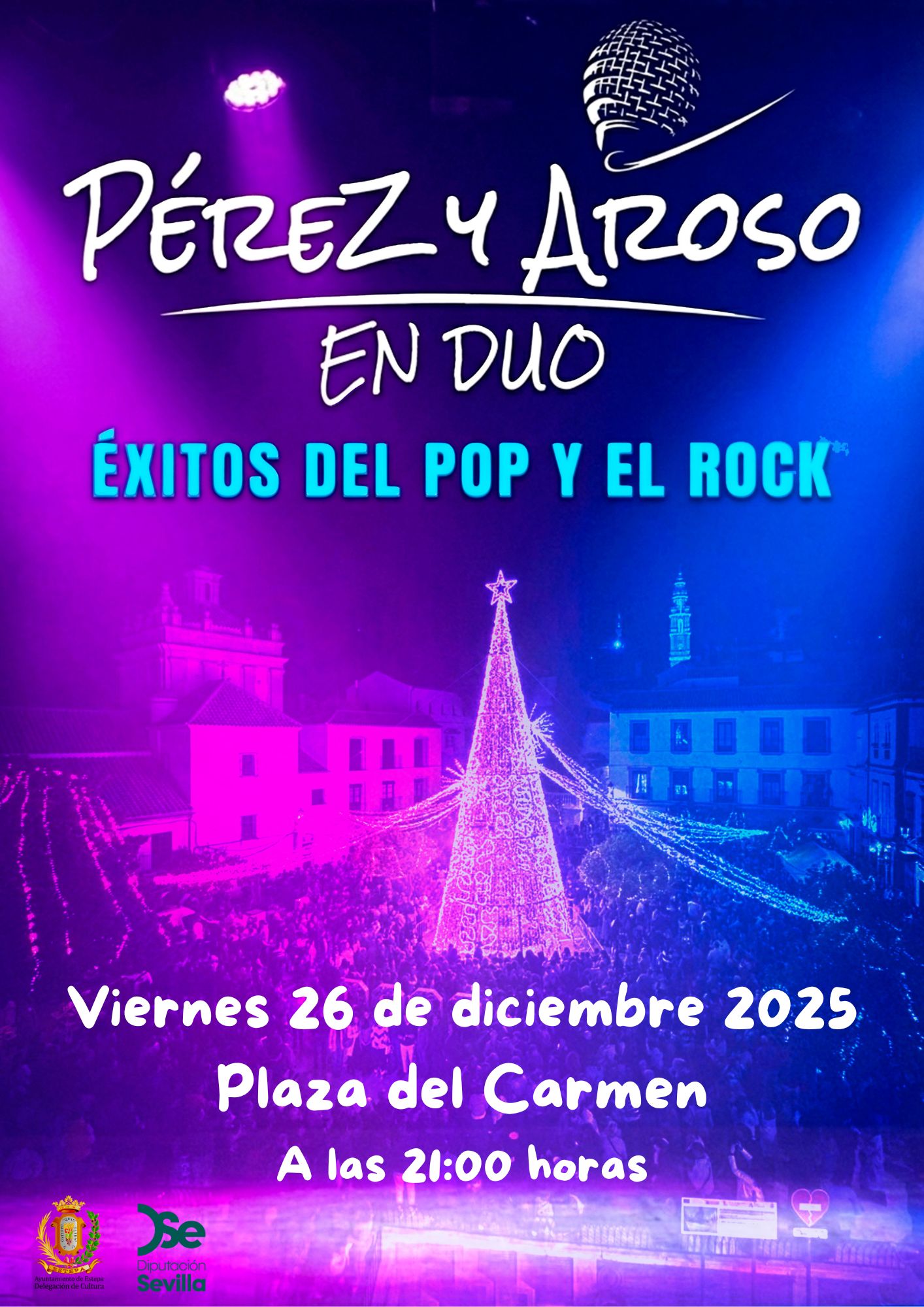 Dentro de las actividades de Navidad, también incluimos la música rock y desde la Delegación de Cultura os invitamos a escuchar los éxitos del pop y el rock que nos traen Pérez Y Aroso en Dúo el viernes 26 de diciembre de 2025 en la Plaza del Carmen a las 21 horas.