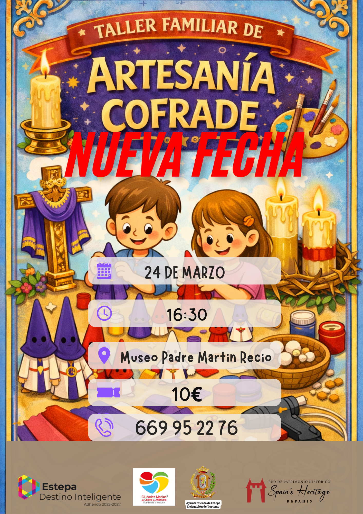 Desde la Concejalía de Turismo de Estepa junto con la Fundación Ciudades Medias, te invitamos a nuestro Taller Familiar de Artesanía Cofrade, donde pequeños y mayores podrán crear manualidades inspiradas en la tradición cofrade además de ser partícipes de ella en divertidas actividades.Música, juegos, pasos, costales, mantillas y enseres únicos de nuestra Semana Santa. Ven a pasar una tarde cofrade y te llevarás un recuerdo de la hermandad que más te guste.