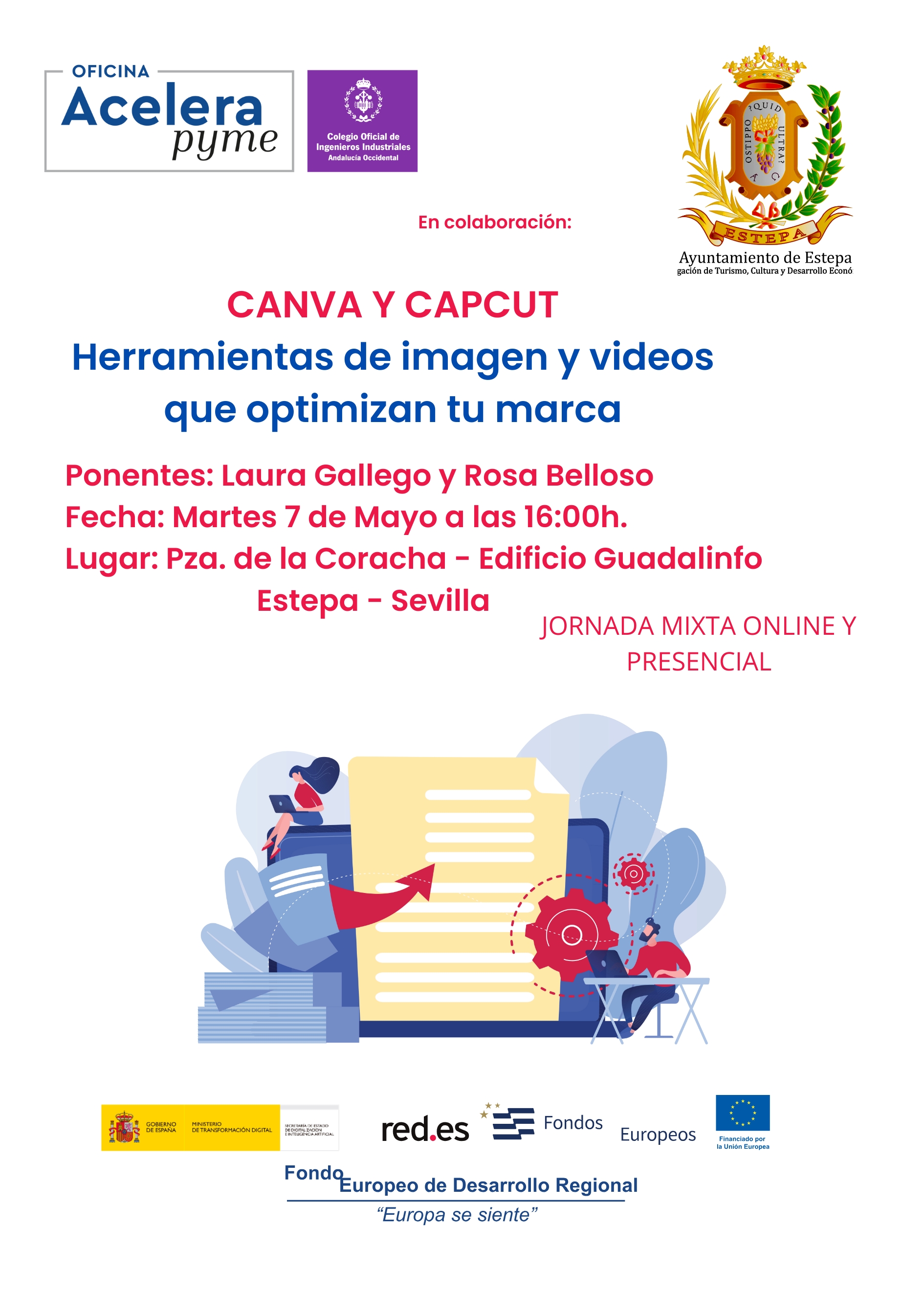 Desde la Delegación de Desarrollo Económico del Ilmo. Ayuntamiento de Estepa (Sevilla) os invitamos a participar en el Taller de Canva y Capcut: Herramientas de Imagen y Vídeo que optimizan tu marca, que tendrá lugar el martes 7 de mayo a las 16:00 h, en el Edificio Guadalinfo.