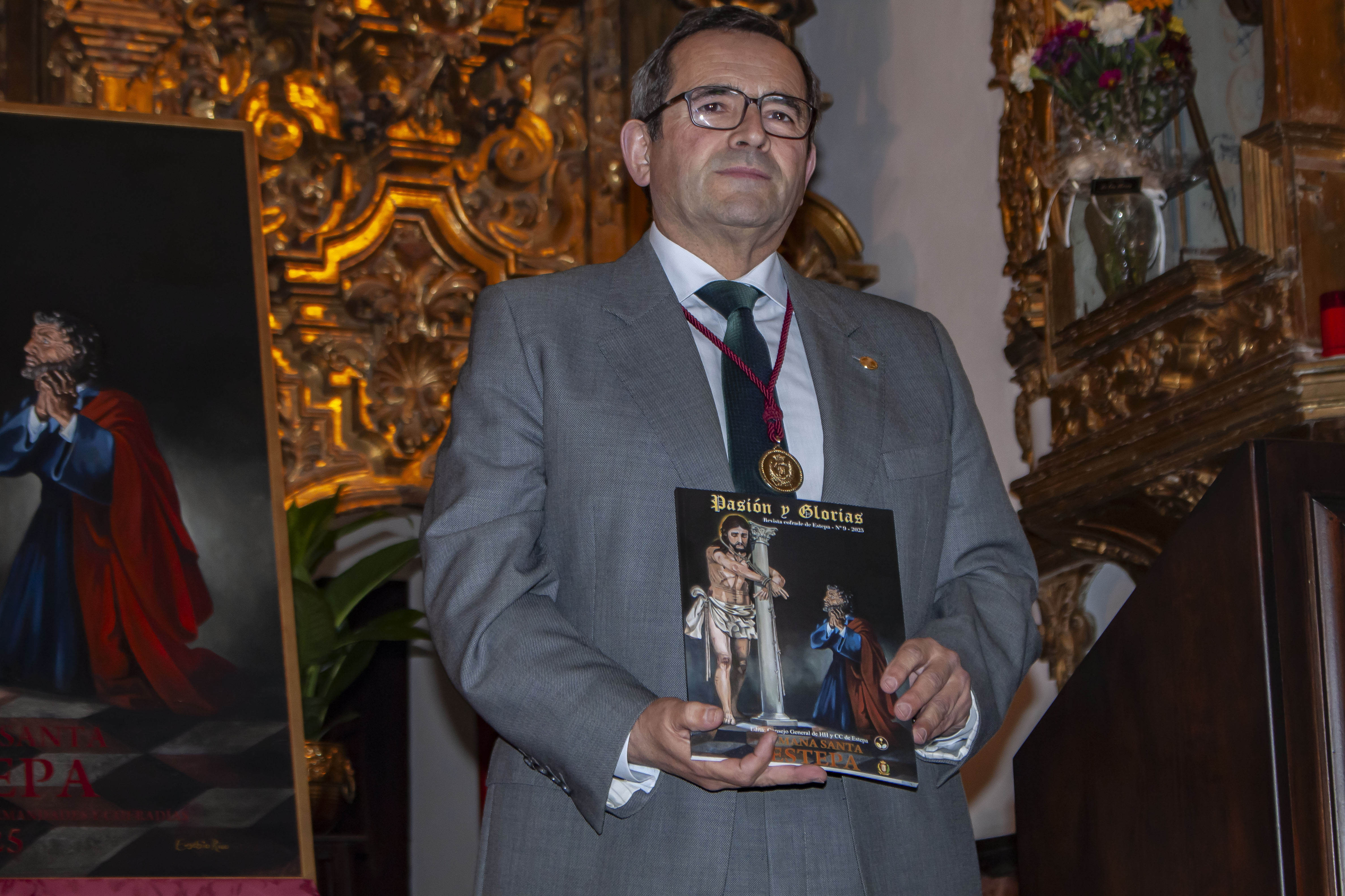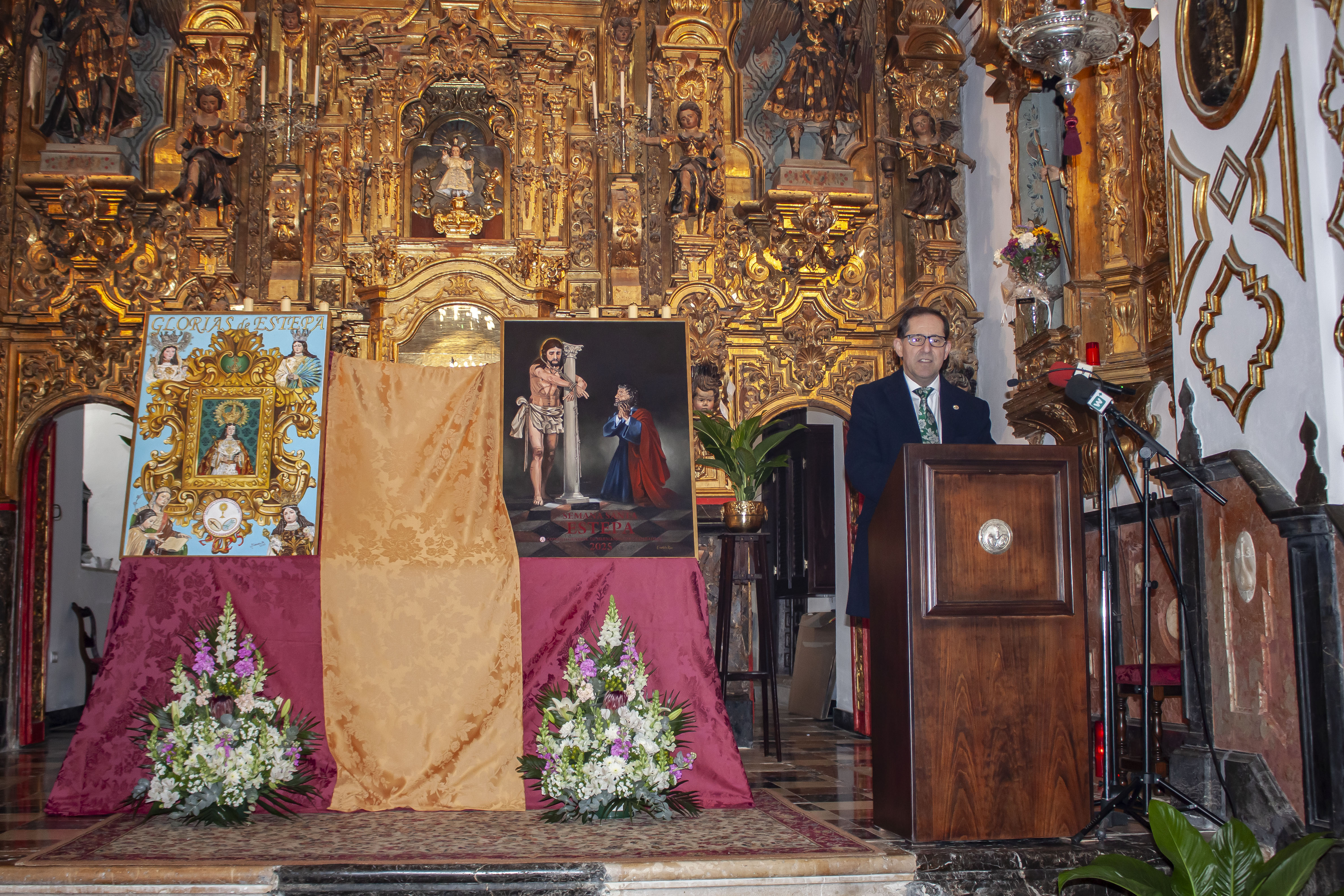 El presidente del Consejo General de Hermandades, Antonio Vicente Bustos Cabello, ha presentado al autor, tanto del cartel de la Semana Santa como al de Las Glorias, Miguel Ángel Borrego Llamas que ha pintado la imagen de la Virgen de la Asunción enmarcada por una cornucopia con las cuatro imágenes de las otras hermandades de Gloria de Estepa, El Carmen, Los Remedios, Santa Ana y La Inmaculada.
