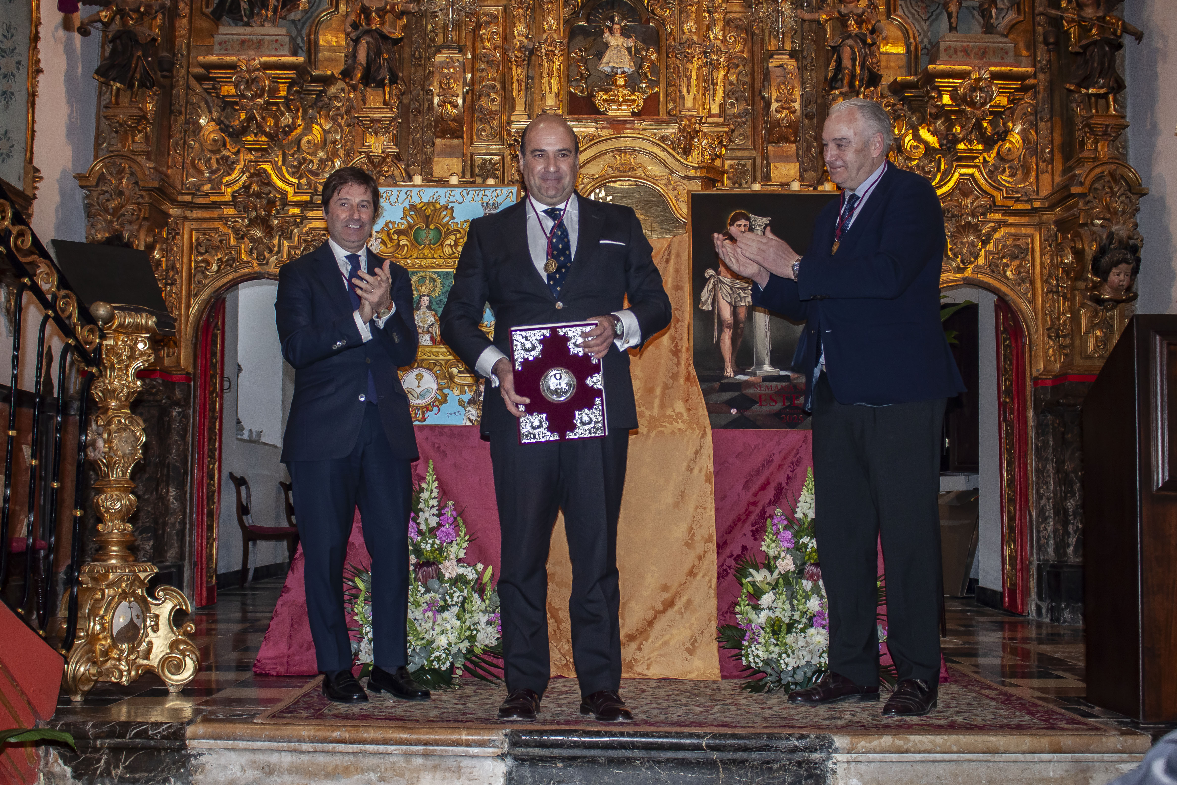 Finalmente ha llegado el turno del pregonero de la Semana Santa de Estepa 2025, Francisco Javier Rodríguez Fernández, que en verso cofrade, ha alabado nuestra fiesta y finalmente ha recogido la medalla del Consejo, junto a su presentador, Gonzalo Marquez Machuca, para después recibir, de manos del presidente sr. Bustos Cabellos, las cubiertas que guardaran las hojas del pregón de la Semana Santa.