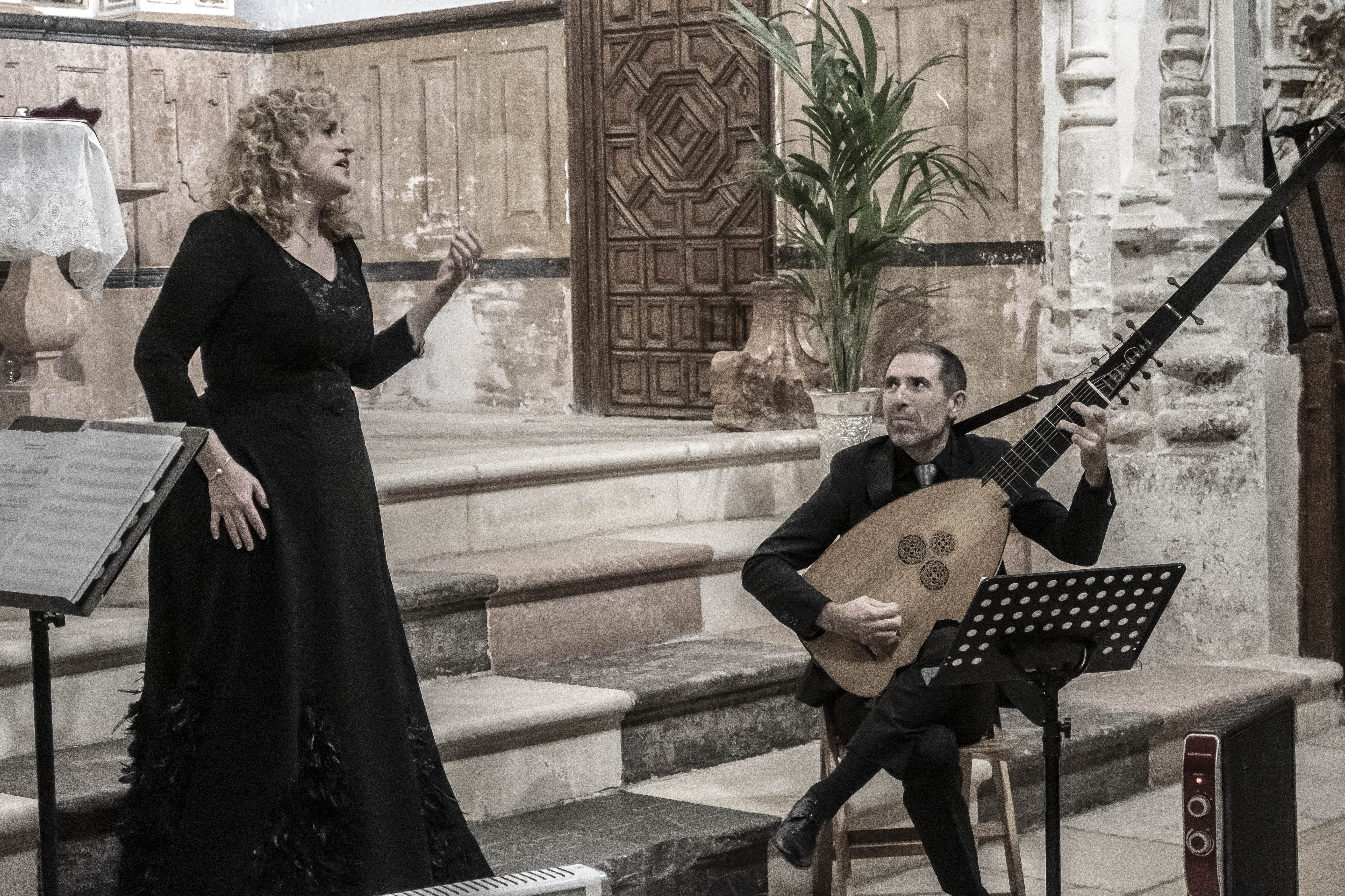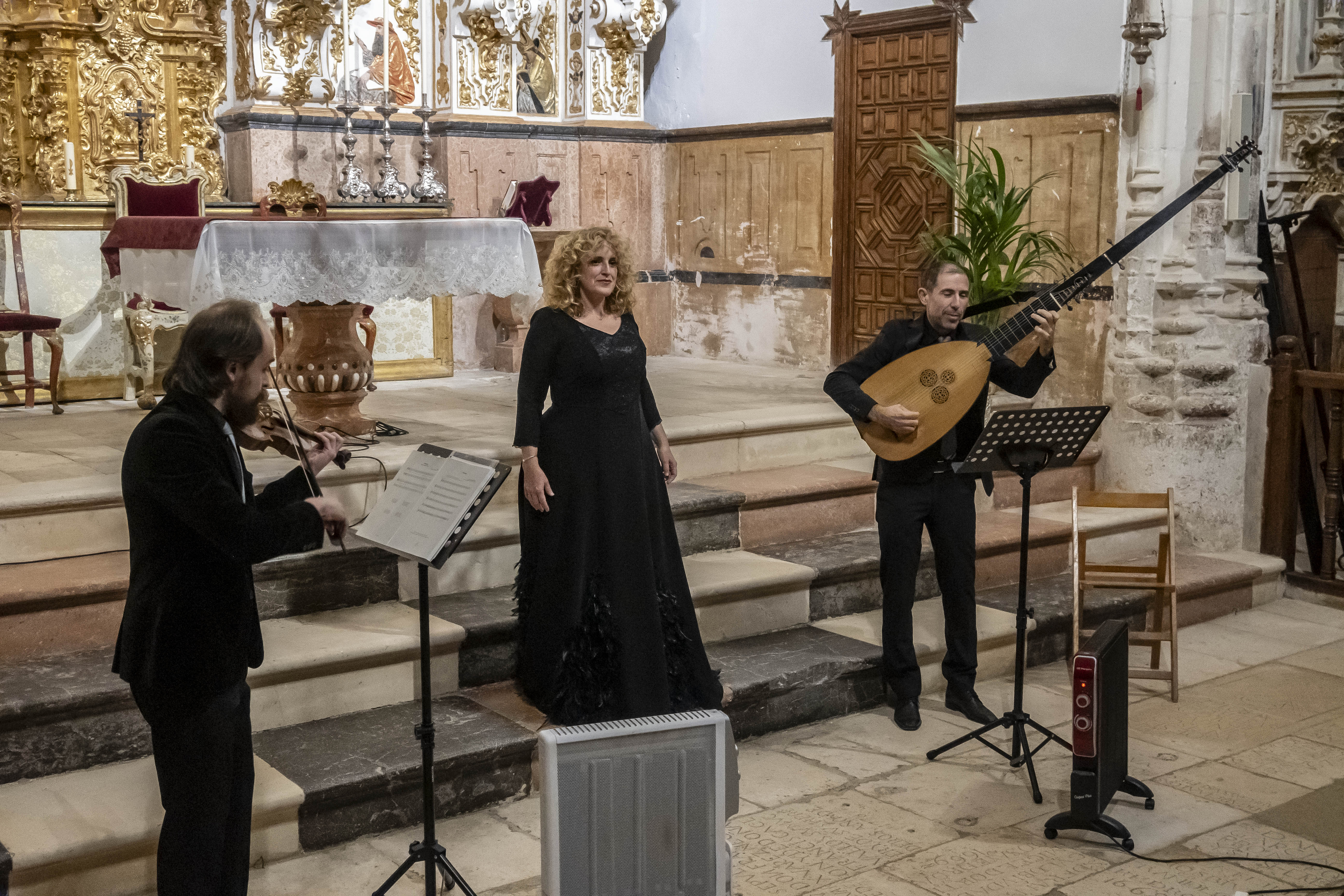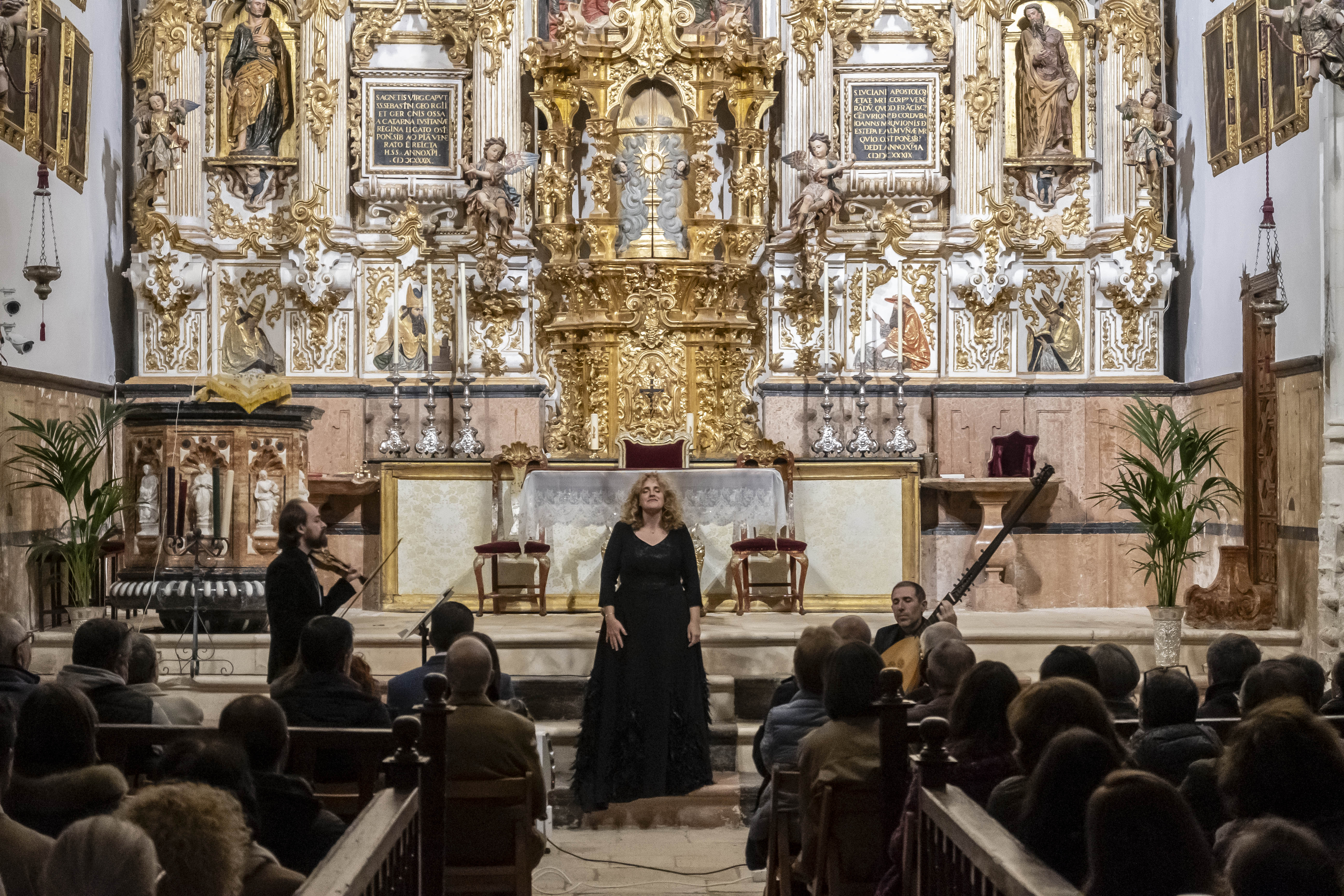 La iglesia de Santa María de Estepa, en el cerro de San Cristóbal, ha acogido esta tarde el concierto inaugural del I Festival de Música Antigua de Estepa. El trío La Galanía, integrado por la soprano Raquel Andueza, el tiorbista Jesús Fernández y el violinista Santiago Danico, han ofrecido en "Perlas del Seiscento" un programa que ha llenado de belleza las bóvedas góticas del templo.