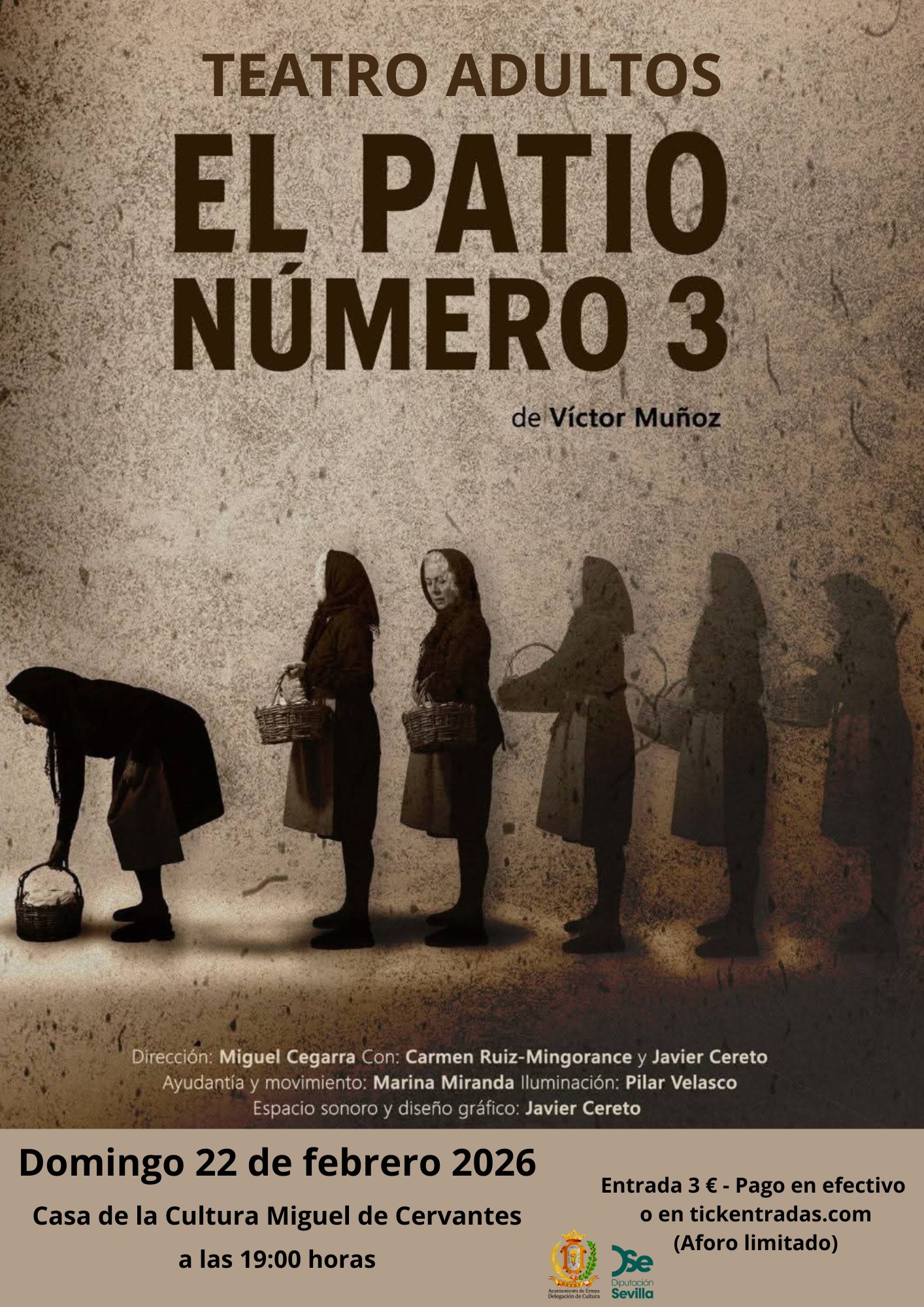 La Delegación de Cultura ofrece el primer teatro del año, con la representación teatral del libro “El Patio Número 3” del escritor estepeño Víctor Muñoz, el domingo 22 de febrero a las 19 horas en la Casa de la Cultura Miguel de Cervantes.