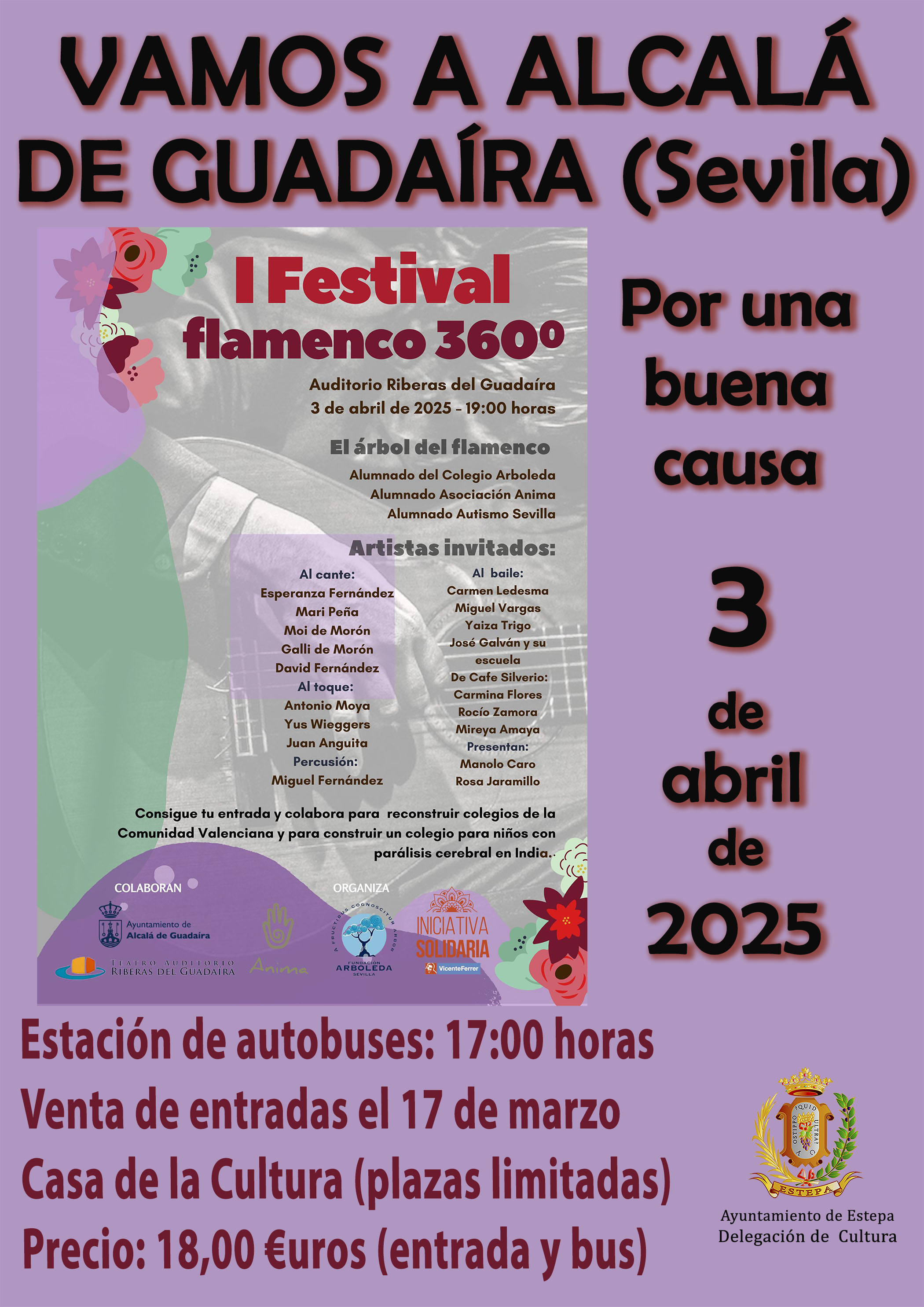 Dicho festival tendrá lugar el jueves 3 de abril en el gran Auditorio Riberas de Guadaíra. Lo llevarán a cabo alumnado de varios niveles educativos del Colegio Arboleda, alumnos de flamenco con capacidades diversas y artistas flamencos y flamencas profesionales del panorama español, como Esperanza Fernández, Carmen Ledesma, José Galván y su escuela, Mari Peña, Galli de Morón, Yaiza Trigo, Moi de Morón, Miguel Vargas, entre otros.
