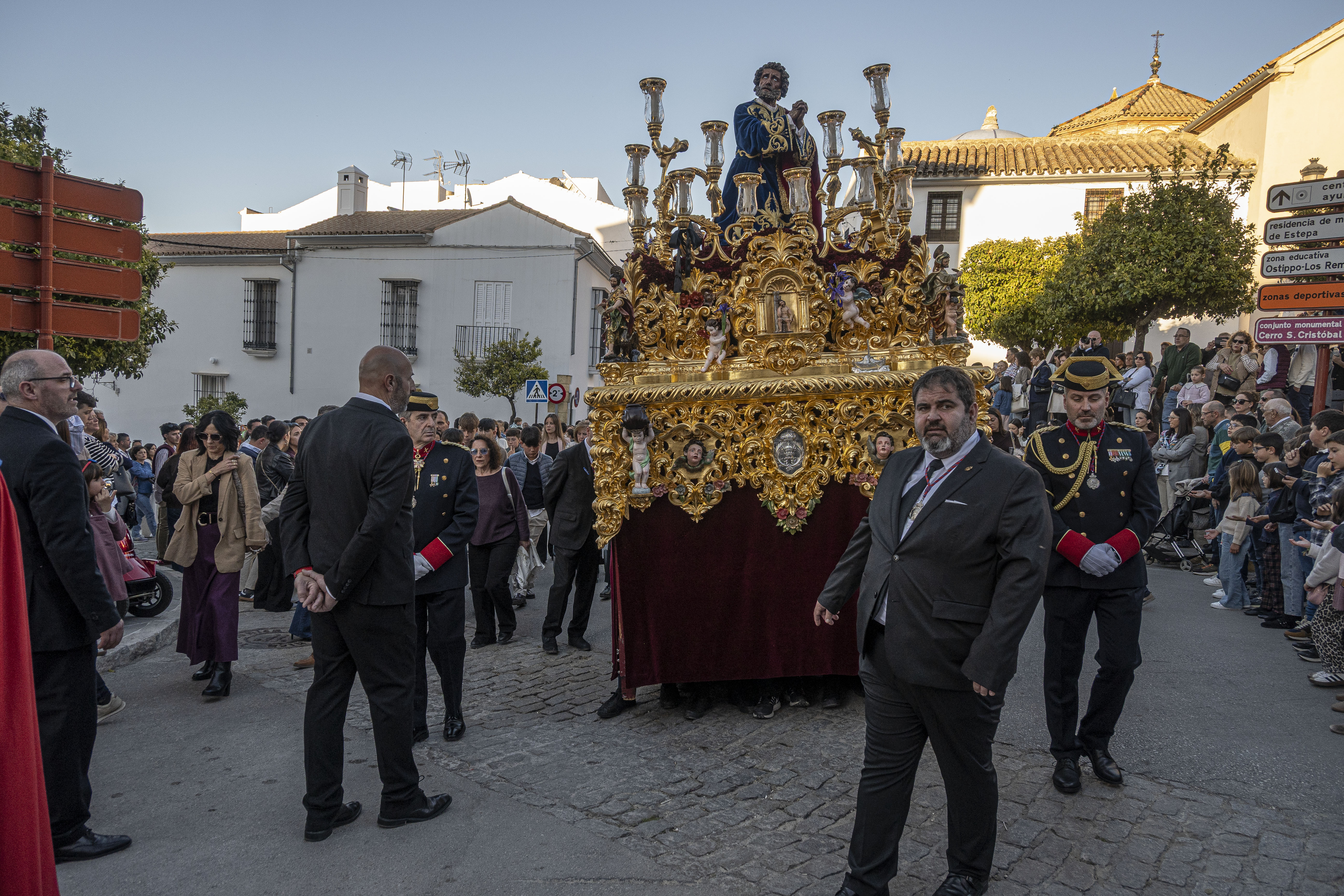 Música: Banda de cornetas y tambores Vera Cruz de Utrera tras el paso de San Pedro y la Banda de Música de Estepa (BAME) detrás del palio.