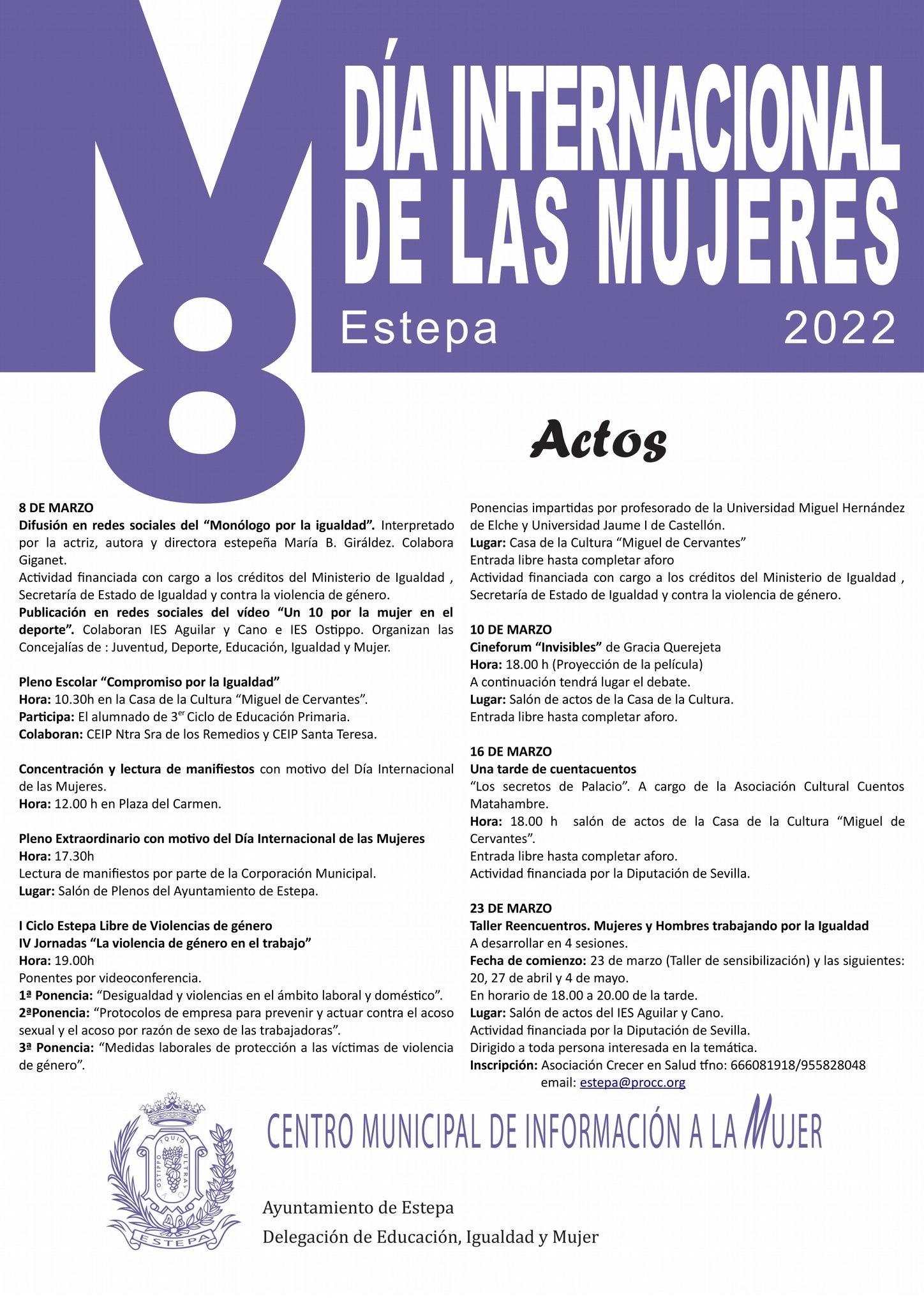 Desde la Concejalía de Educación, Igualdad y Mujer os invitamos a participar en los actos programados con motivo del "Día Internacional de las Mujeres".