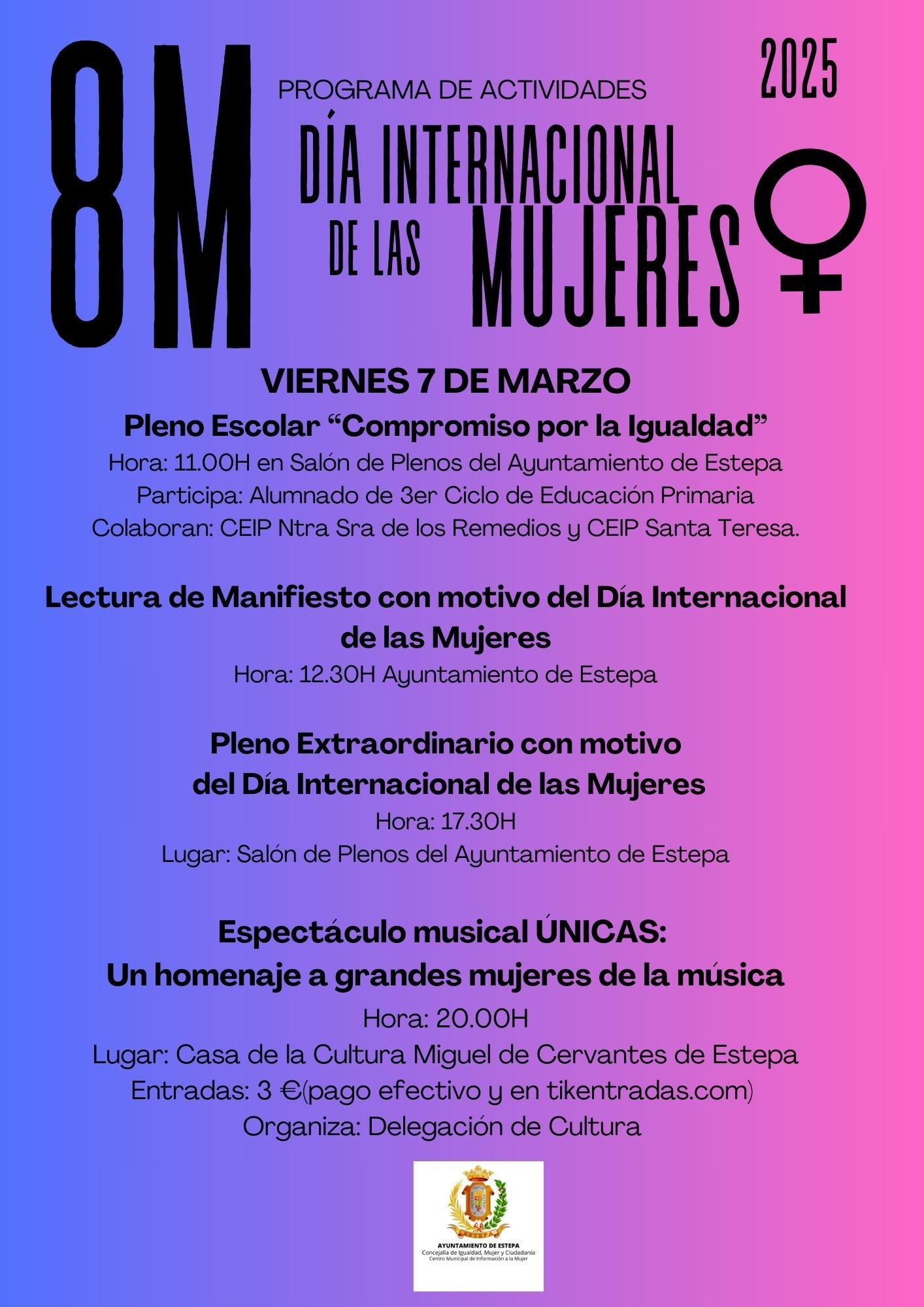 Celebración del 8M Día Internacional de la Mujer. Viernes 7 de marzo tendrá lugar la celebración del Día Internacional de las Mujeres 8M, con una serie de actos organizados por el Centro Municipal de Información a la Mujer.