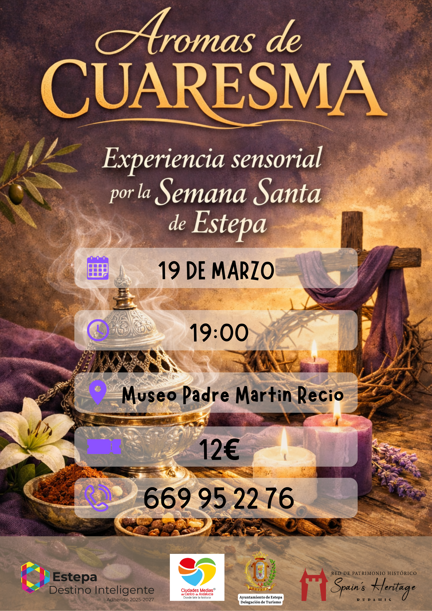 Desde la Concejalía de Turismo y Patrimonio de Estepa junto con la Fundación Ciudades Medias, te invitamos a descubrir Aromas de Cuaresma, una experiencia sensorial por nuestra Semana Santa que no te dejará indiferente.