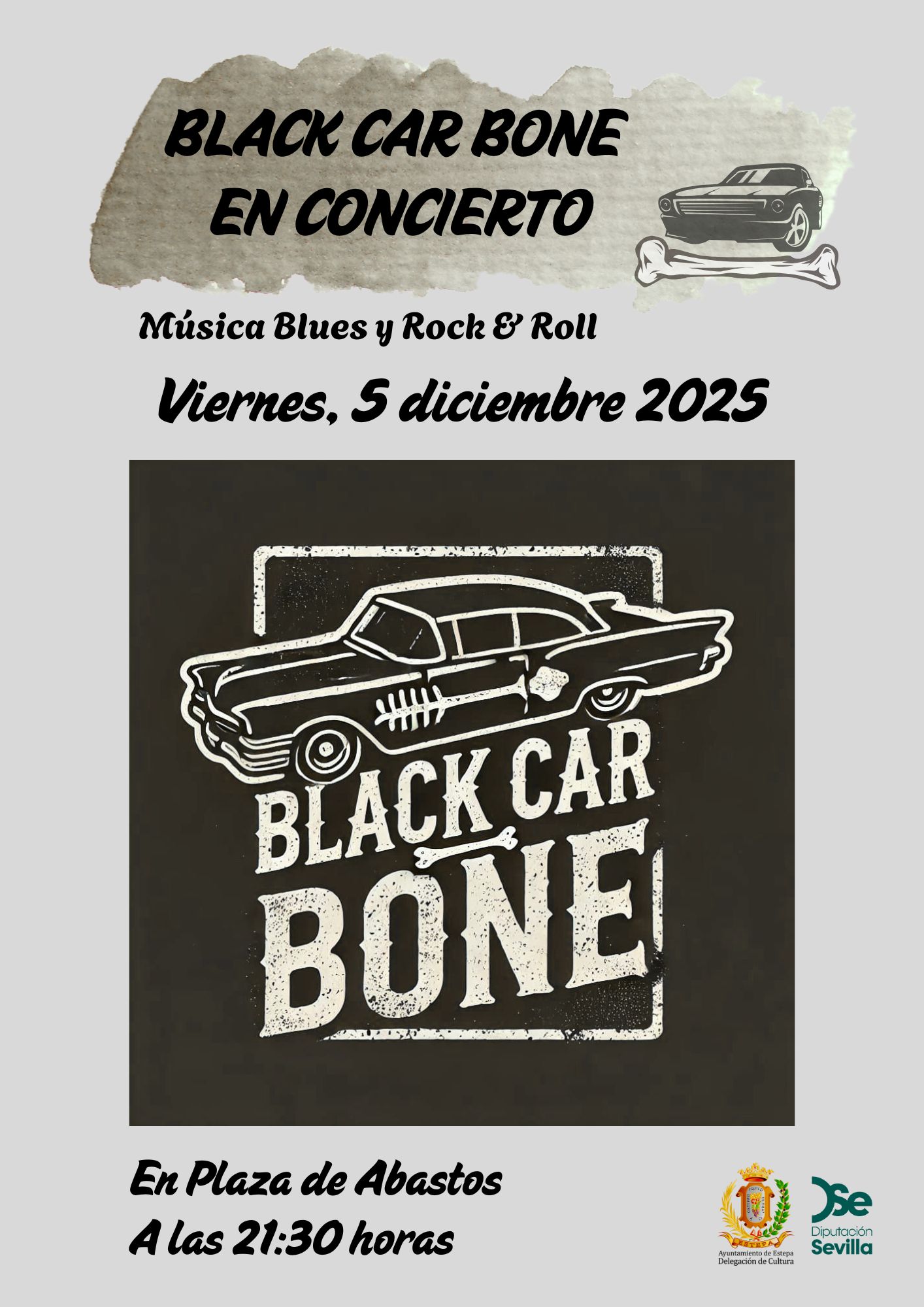 Continuamos los conciertos también en el mes de diciembre. Desde la Delegación de Cultura os invitamos a asistir a un concierto de música blues y rock and roll con el grupo Black Car Bone el viernes 5 de diciembre en la Plaza del Mercado de Abastos a las 21:30 horas.