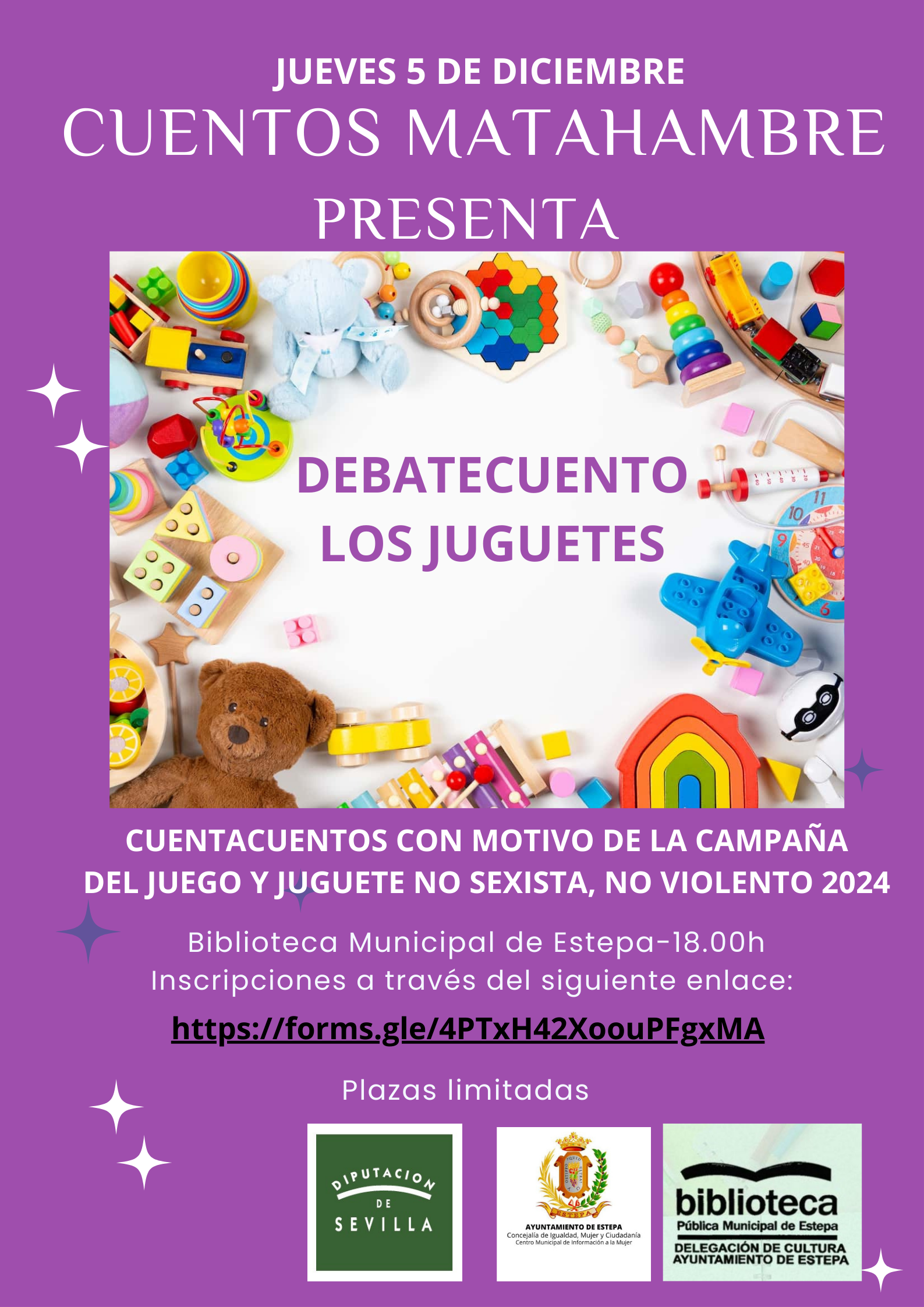 El próximo 5 de diciembre a las 18.00 h tendrá lugar en la Biblioteca Municipal la sesión de cuentacuentos "DEBATECUENTO LOS JUGUETES" a cargo de la Asociación Cuentos Matahambre. Actividad organizada por el Centro Municipal de Información a la Mujer y financiada por la Diputación de Sevilla.
