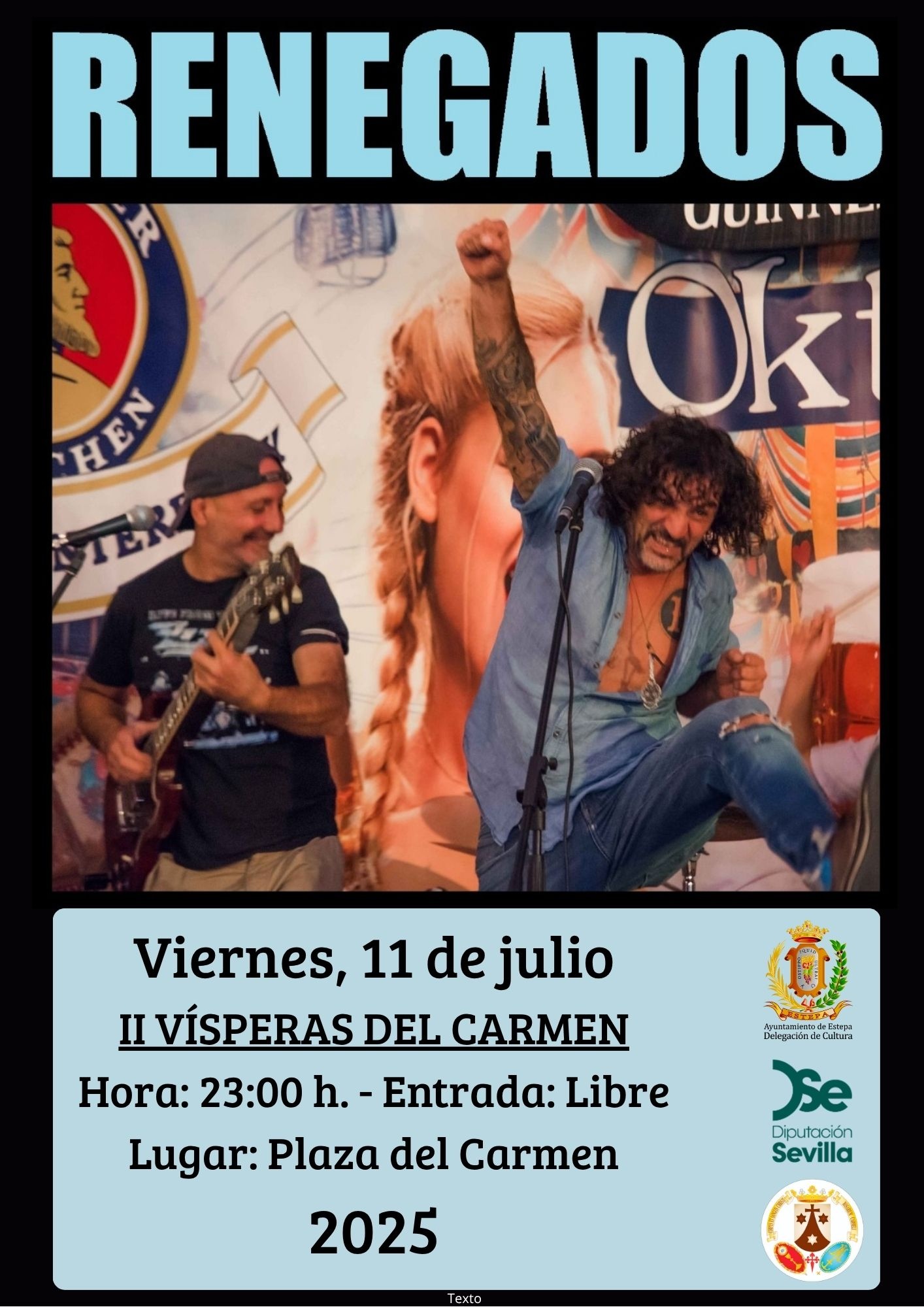 En este Verano Cultural de 2025, la Delegación de Cultura, junto con la Hermandad del Carmen organiza las 2as Vísperas del Carmen con el grupo RENEGADOS. Una banda sevillana especializada en versiones de grandes éxitos del pop y rock de los años 80 y 90. Con un sonido potente y una energía arrolladora en el escenario, el grupo rinde homenaje a las canciones que marcaron una generación, rescatando clásicos nacionales e internacionales que todos llevamos en la memoria.