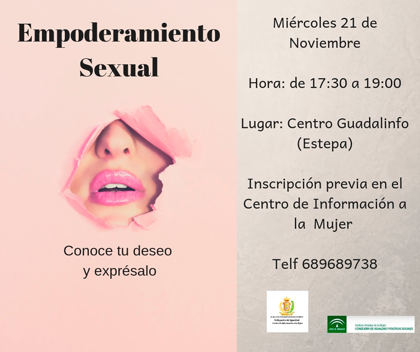 "EL día 21 de noviembre tendrá lugar en Centro Guadalinfo una charla sobre empoderamiento sexual bajo el título "Conoce tu deseo y exprésalo", actividad organizada por el Centro de Información a la Mujer del Ayuntamiento de Estepa, con motivo del Día Internacional contra la Violencia de Género"