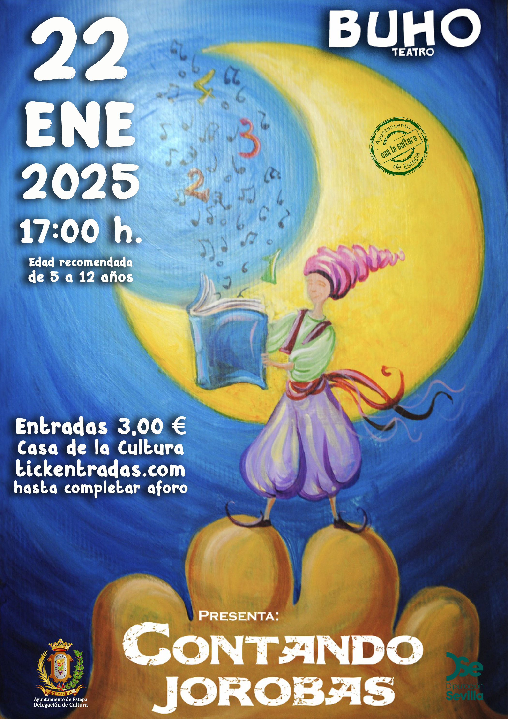 La Delegación de Cultura comienza el año con un espectáculo dirigido a los más pequeños de la casa con títeres y música "Contando Jorobas", de la prestigiosa compañía sevillana Búho Teatro y recomendado para niños y niñas de 5 a 12 años.