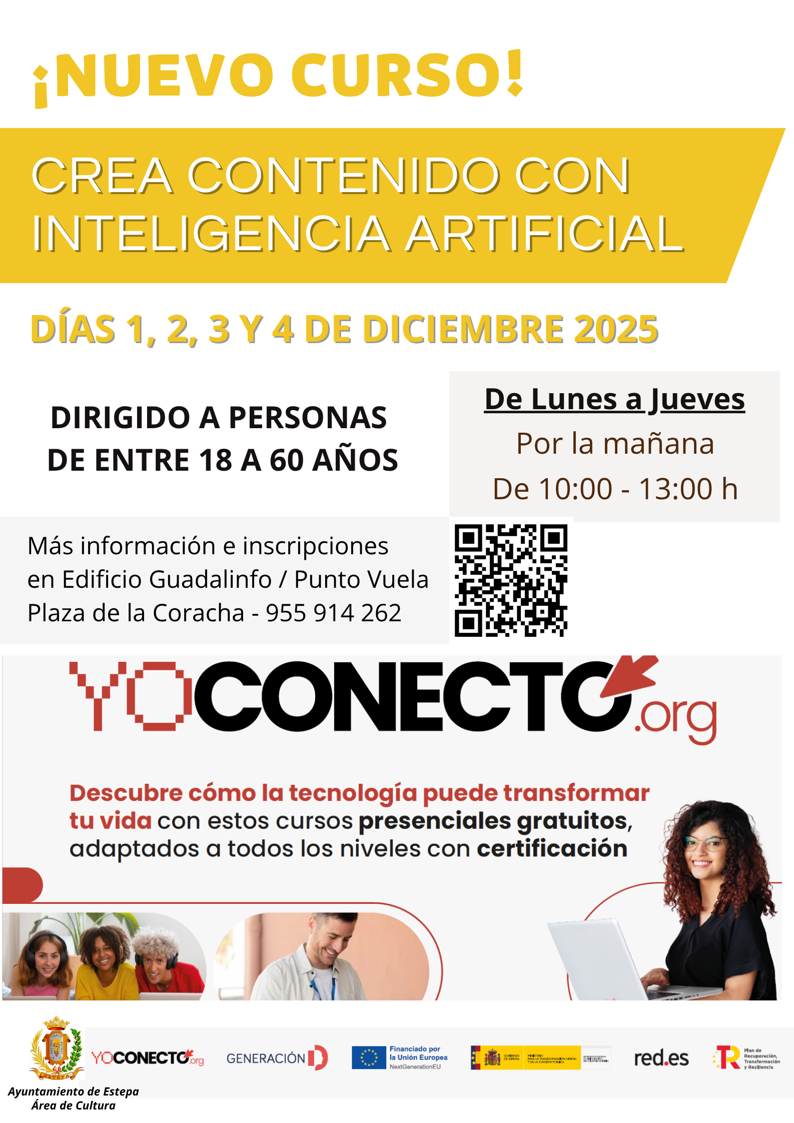 A través de la Delegación de Cultura y Desarrollo Económico del Ayuntamiento de Estepa, y gracias a la colaboración establecida con YOCONECTO.ORG, se ofrece el Curso Crea Contenido con Inteligencia Artificial (12 horas). El curso tendrá lugar los días 1, 2, 3 y 4 de diciembre, en horario de 10 a 13 h.