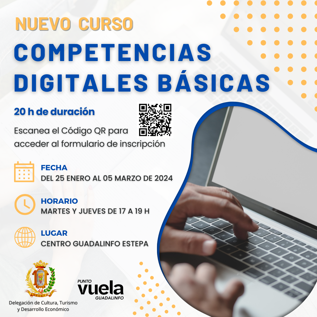 Desde la Delegación de Cultura, Turismo y Desarrollo Económico, se ofrece la posibilidad a todas las personas mayores de 16 años, de realizar este curso de 20 horas de duración, mediante el que podrán adquirir o mejorar sus Competencias Digitales Básicas.