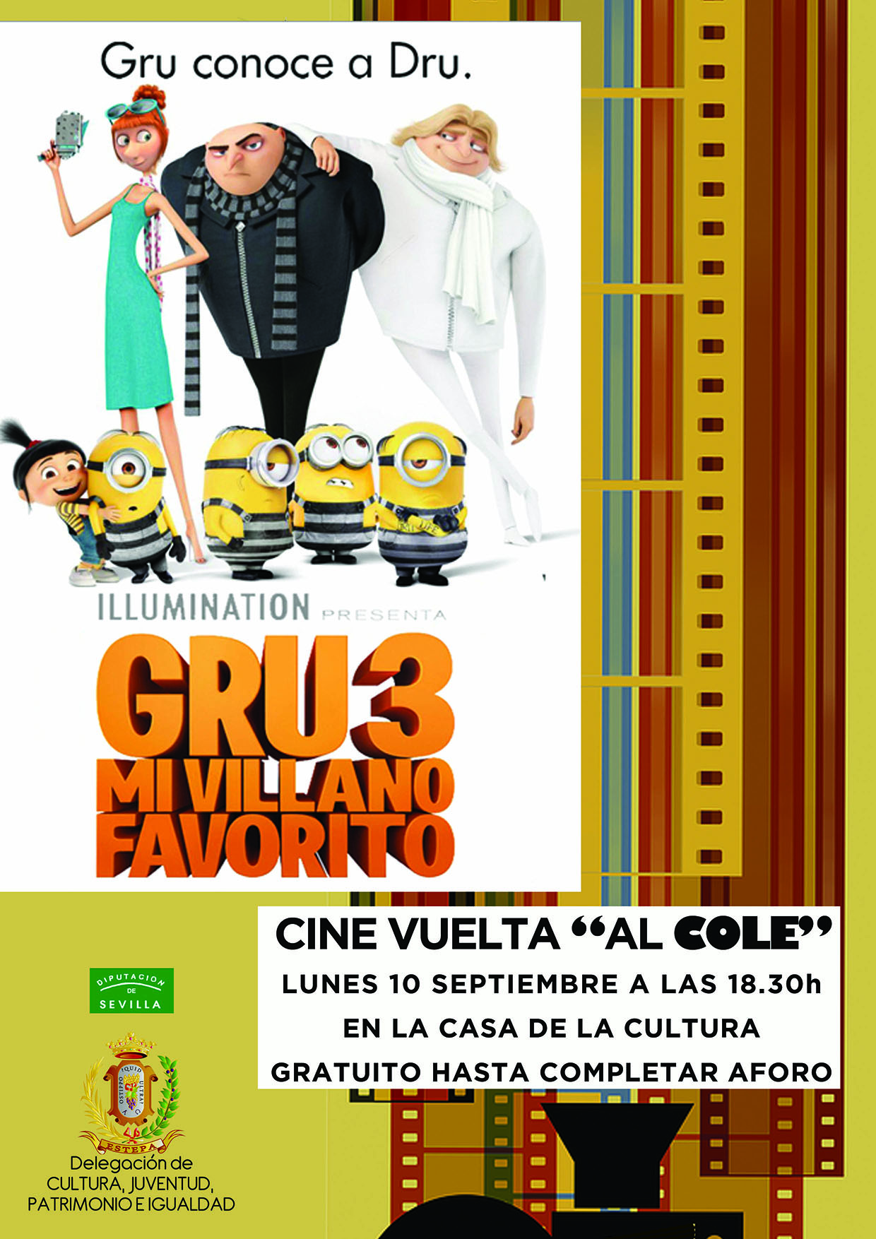 Para celebrar la vuelta al cole, la Delegación de Cultura prepara una jornada de cine que tendrá lugar el próximo lunes 10 de septiembre a las seis y media de la tarde en la casa de la cultura con la proyección de la película Gru 3
