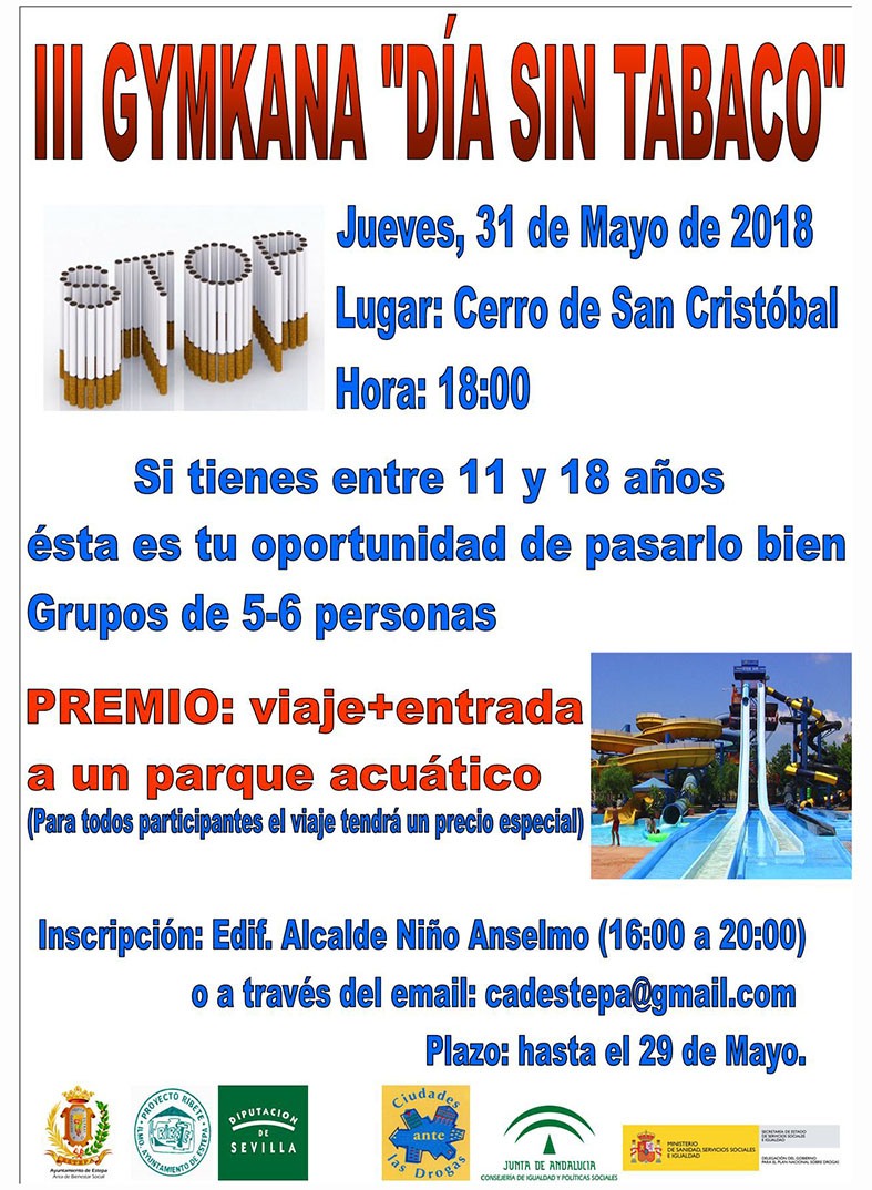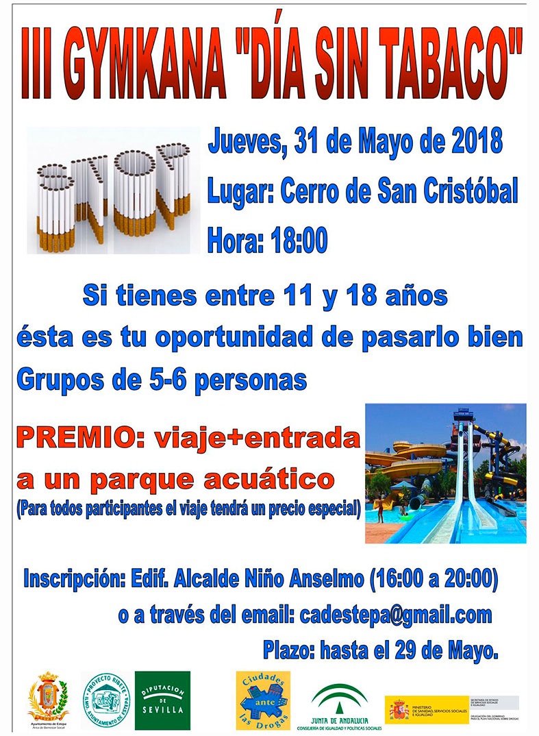Desde Ciudades ante las Drogas y Ribete, volvemos un año más con la gymkana por el DÍA SIN TABACO. Será el próximo Jueves, 31 de Mayo a las 18:00 h en el Cerro de San Cristóbal.