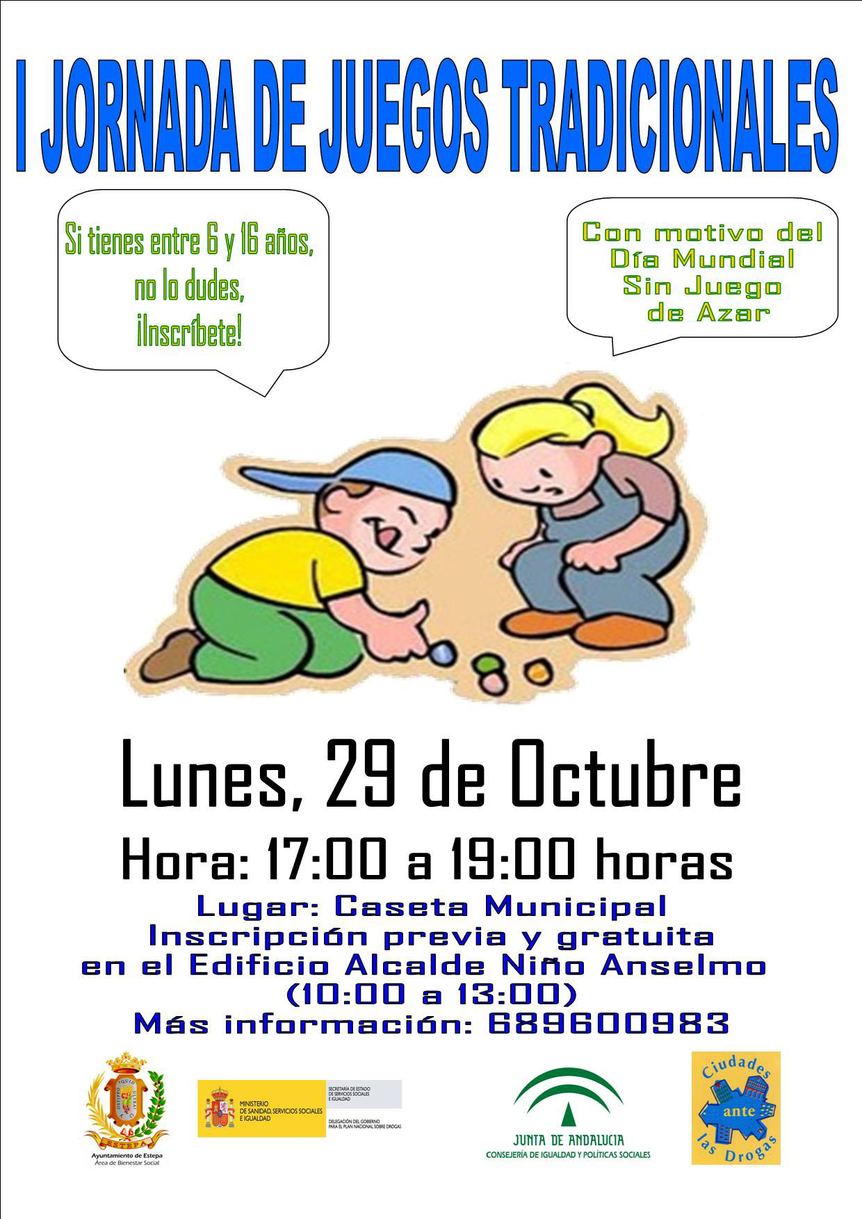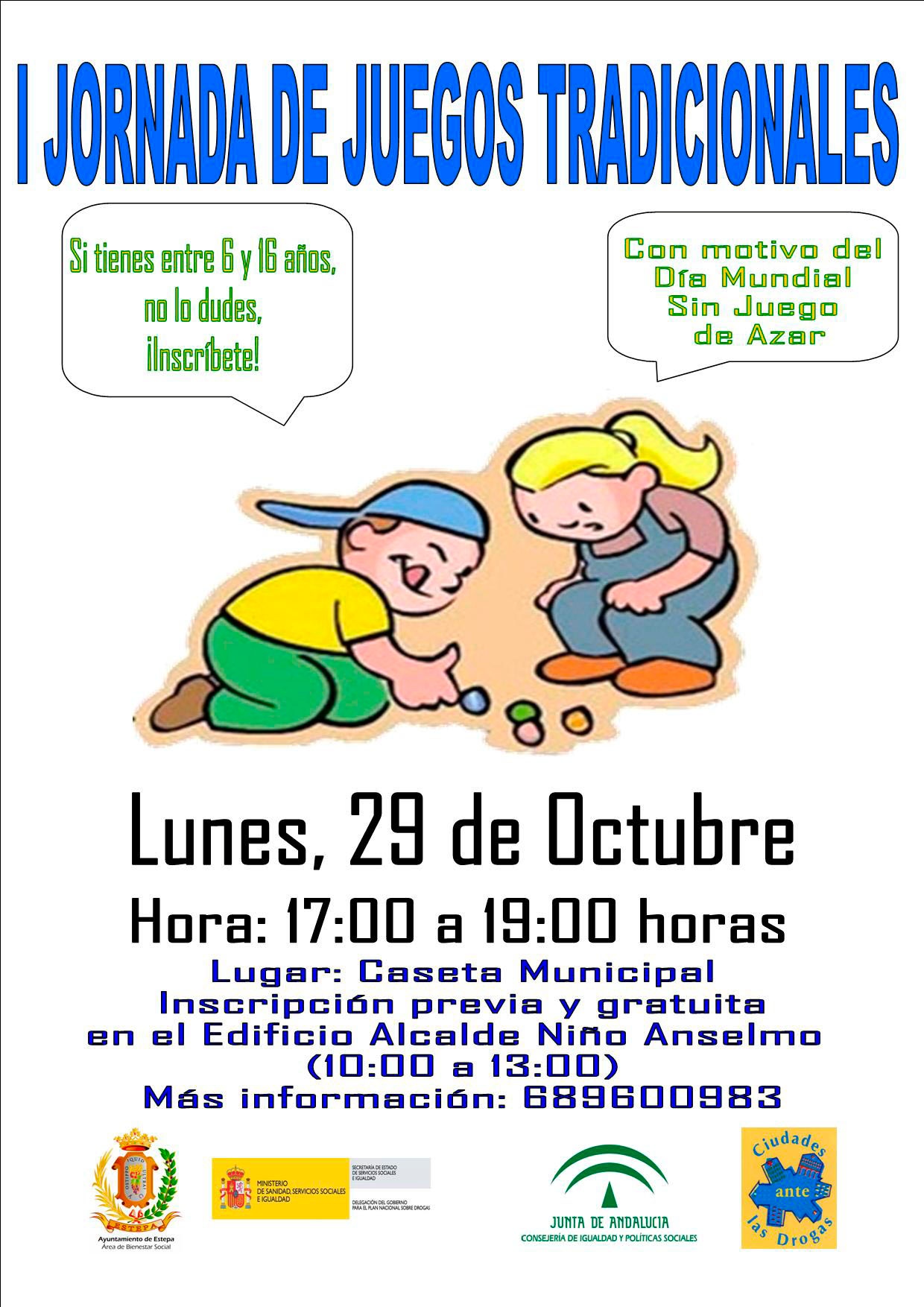 El próximo día 29 de Octubre, y con motivo del DÍA MUNDIAL SIN JUEGO DE AZAR, se celebra la I JORNADA DE JUEGOS TRADICIONALES en la Caseta Municipal de Estepa.