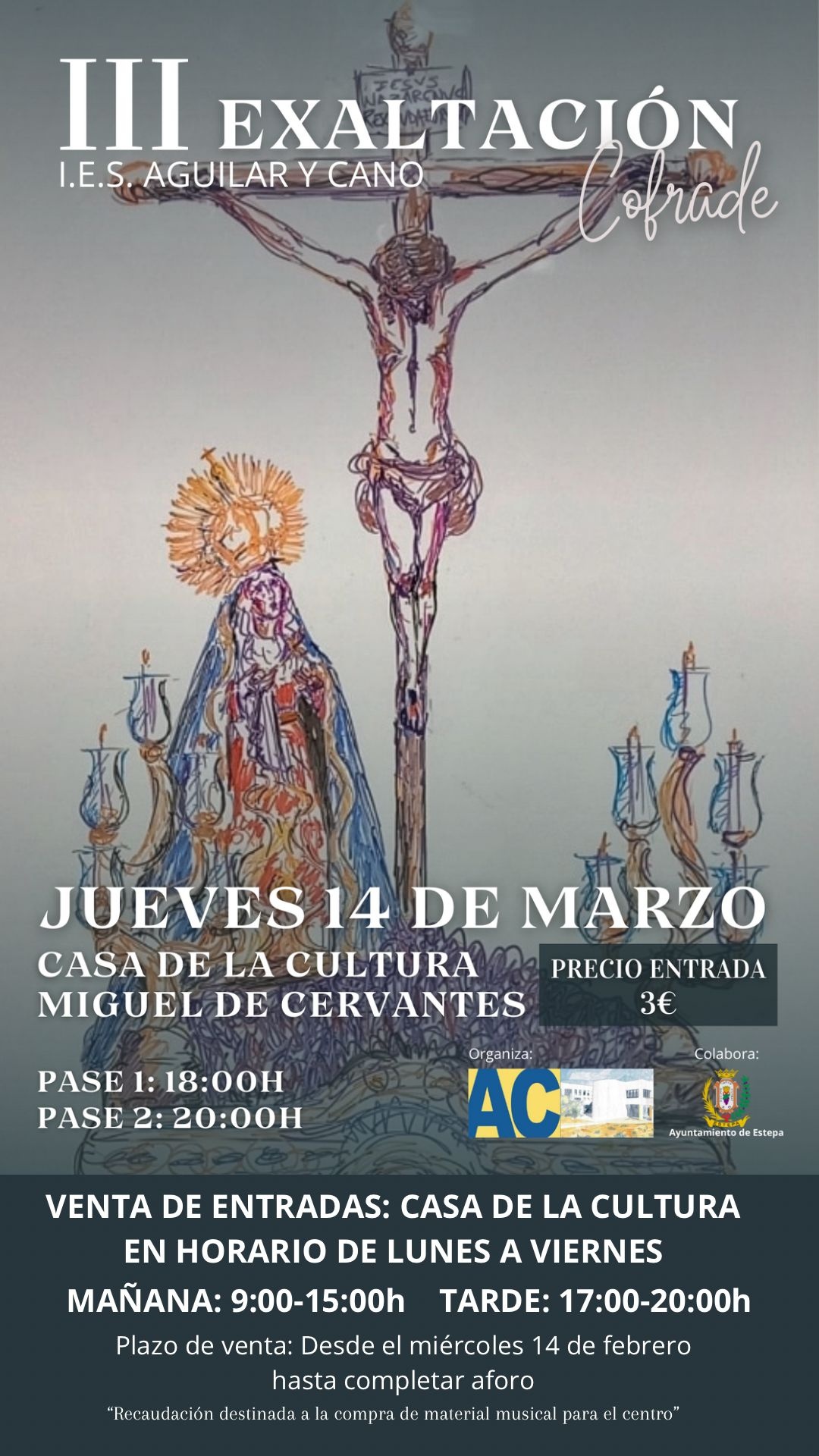 El IES Aguilar y Cano ofrece su III Exaltación Cofrade el próximo 14 de marzo en un acto multidisciplinar en el que varios de sus alumnos, junto con algunos padres, interpretarán una decena de marchas procesionales. Simultáneamente, los asistentes podrán disfrutar del visionado de un montaje protagonizado por nuestros pasos y del proceso de creación del profesor Joaquín Alonso, que improvisará sobre la pizarra la emoción experimentada en torno a esta exaltación.
