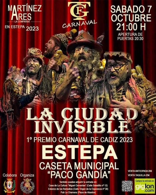 Este sábado 7 de octubre, la Comparsa de Martínez Ares, ¡1º Premio Carnaval de Cádiz 2023!, estará en Estepa presentando su espectáculo: La Ciudad Invisible". No te lo puedes perder.