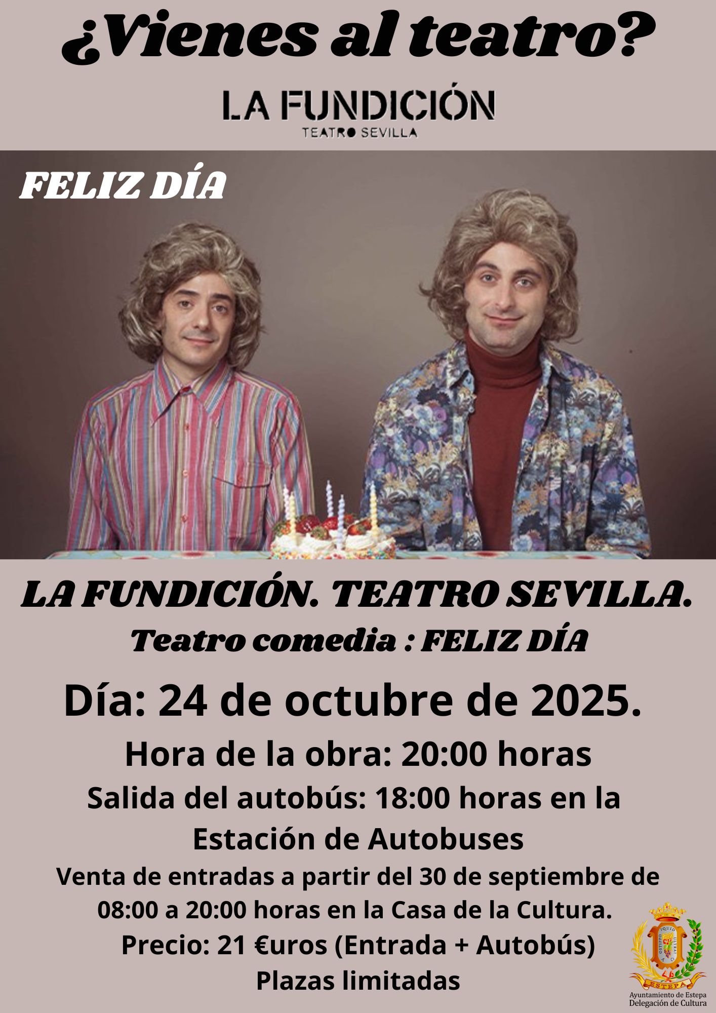 La Delegación de Cultura te propone asistir al teatro Feliz Día de la compañía Sutottos en el Teatro Sevilla La Fundición, el día 24 de octubre de 2025 a las 20:00 horas.