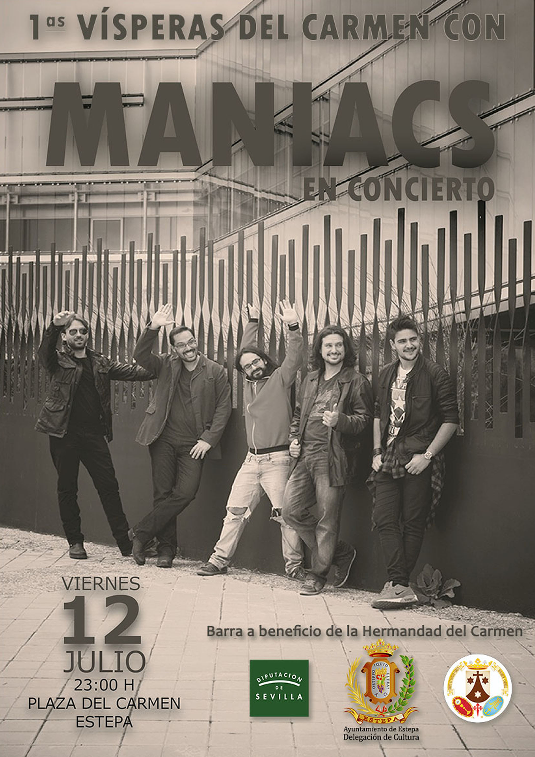 En este Verano Cultural de 2024, la Delegación de Cultura, junto con la Hermandad del Carmen organiza las 1as Vísperas del Carmen con el grupo MANIACS VERSIONES. En este grupo en el que cada miembro aporta su experiencia para ofrecer un espectáculo donde la actitud y la interacción con el público es tan importante como el sonido y la exactitud de la versión.