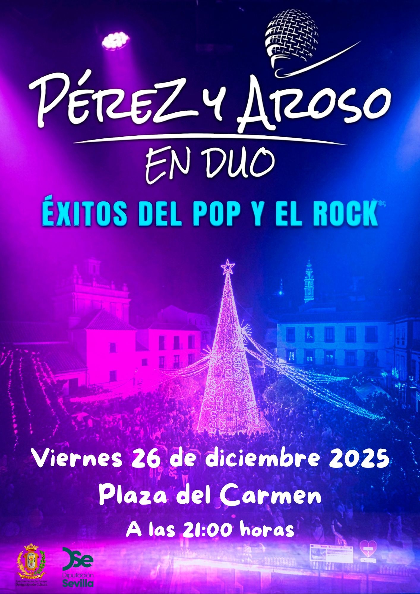 Dentro de las actividades de Navidad, también incluimos la música rock y desde la Delegación de Cultura os invitamos a escuchar los éxitos del pop y el rock que nos traen Pérez Y Aroso en Dúo el viernes 26 de diciembre de 2025 en la Plaza del Carmen a las 21 horas.