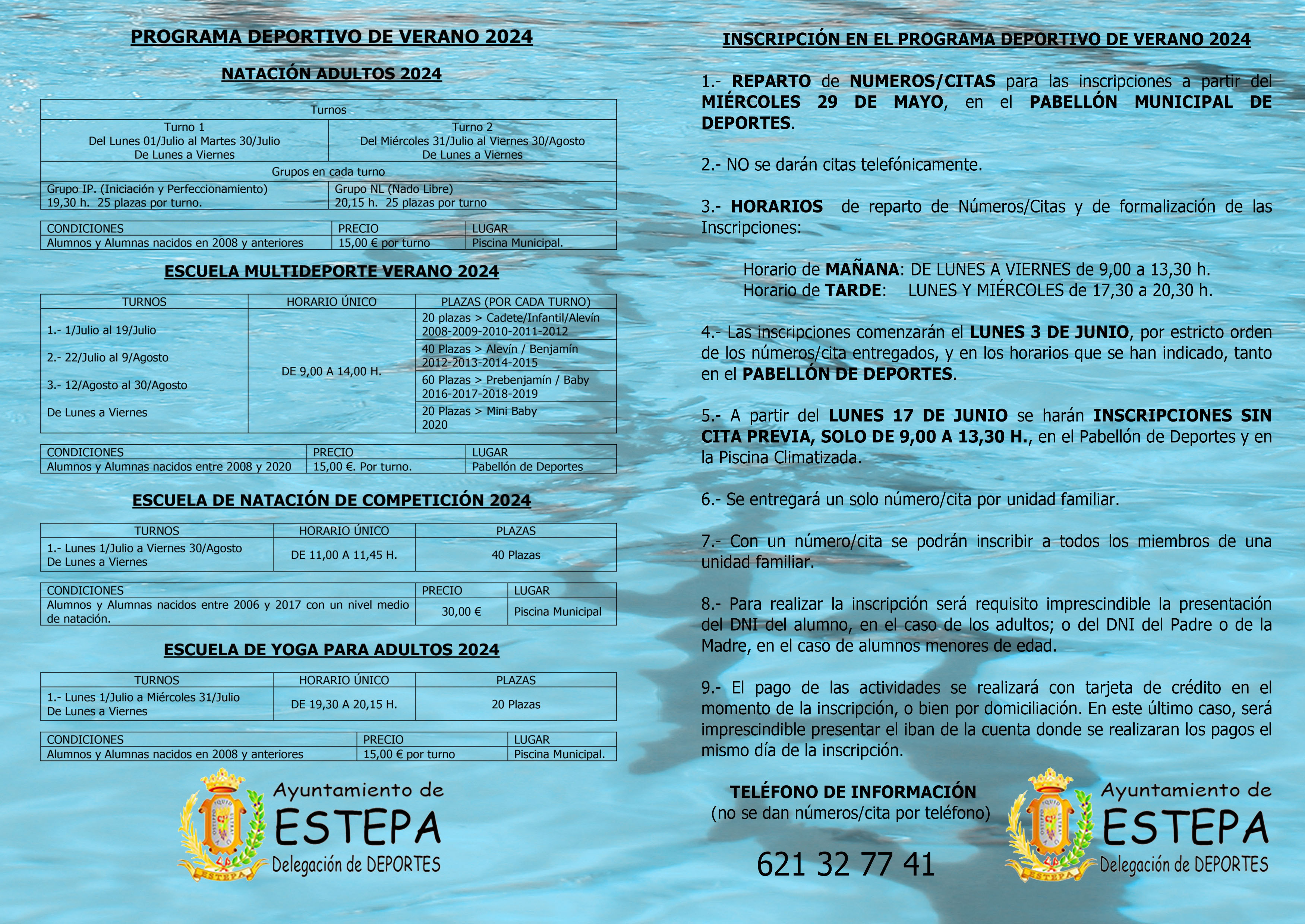 A partir del miércoles 29 de Mayo, y desde las 9 de la mañana, podrás recoger en el Pabellón Municipal de Deportes tu cita para inscribirte en las actividades deportivas de este verano 2024.
