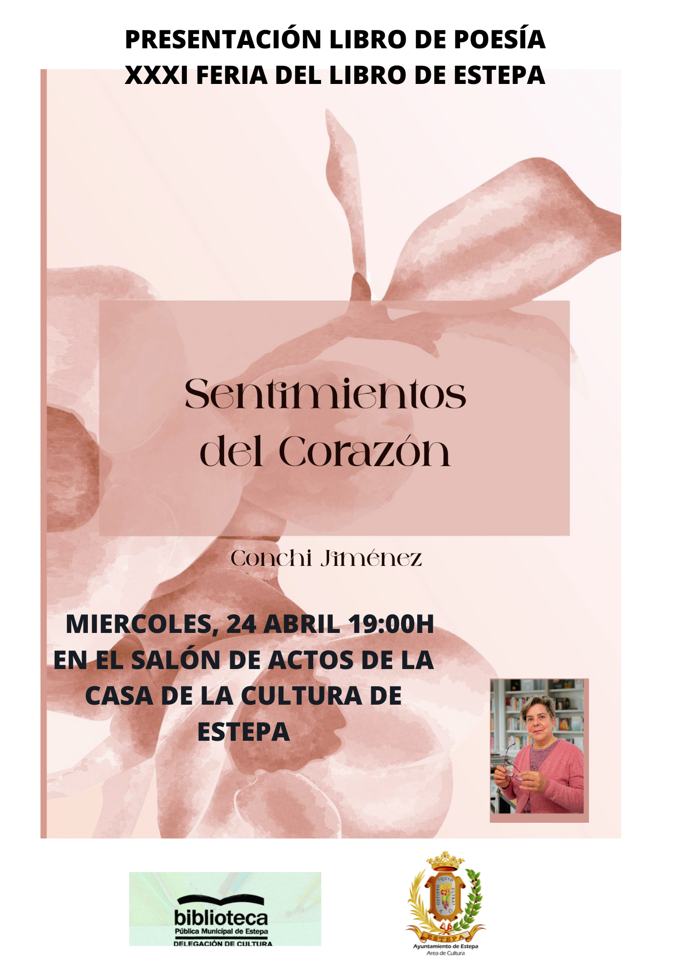 El próximo miércoles, 24 de abril, a las 19:00h. se realizará en el Salón de Actos de la Casa de la Cultura "Miguel de Cervantes" de Estepa, la presentación del libro de poesía de nuestra vecina de Estepa, Conchi Jimenez, titulado "SENTIMIENTOS DEL CORAZÓN".