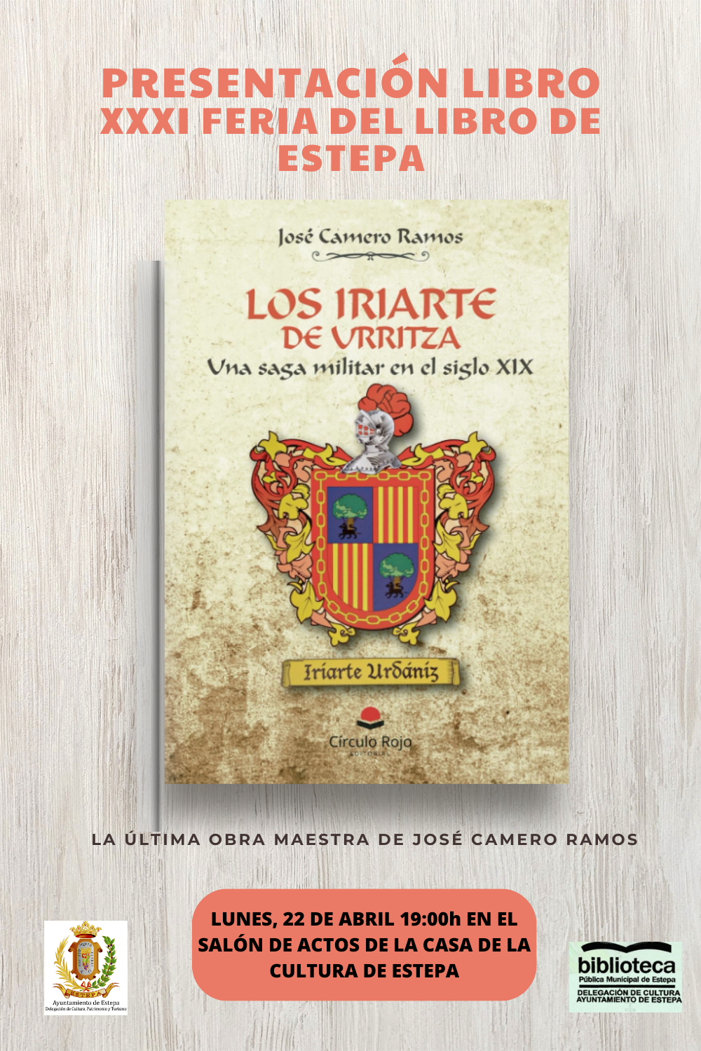 Desde la Delegación de Cultura, el próximo lunes, 22 de abril a las 19:00h. se realizará en el Salón de Actos de la Casa de la Cultura "Miguel de Cervantes" de Estepa, la presentación del libro "LOS IRIARTE DE URRITZA: UNA SAGA MILITAR EN EL SIGLO XXI".