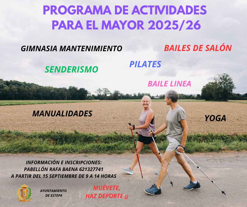 A PARTIR DEL PRÓXIMO DIA 15 DE SEPTIEMBRE, COMIENZA EL PLAZO DE INSCRIPCIÓN DE ACTIVIDADES PARA EL MAYOR EN EL PABELLÓN DE DEPORTES RAFA BAENA EN HORARIO DE 9 H A 14 H.