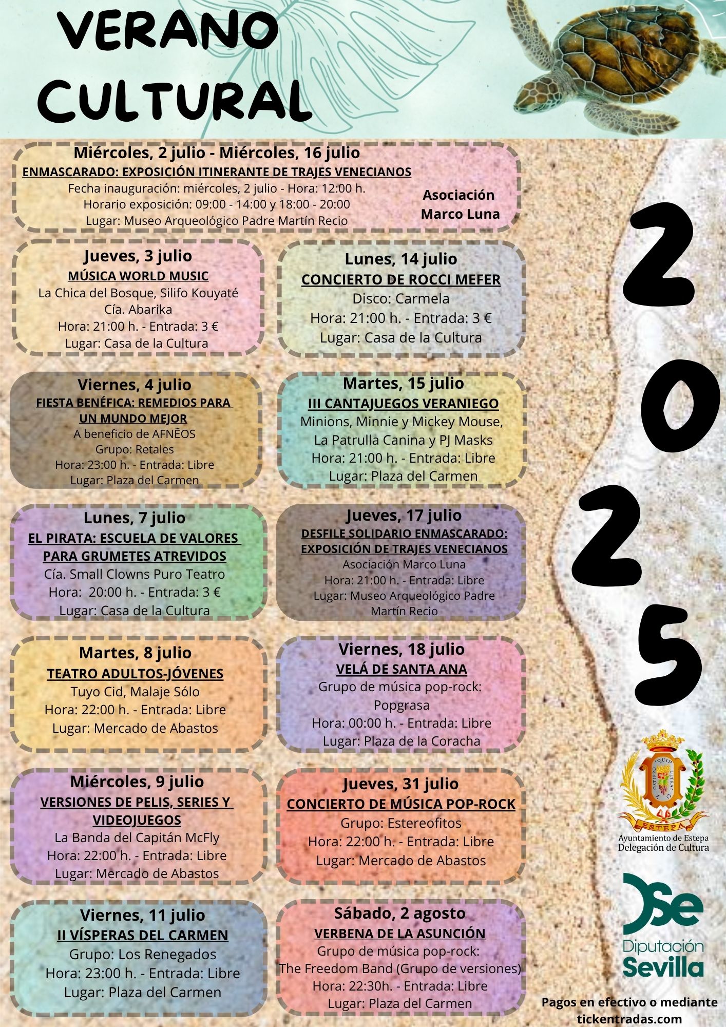 La Delegación de Cultura os presenta el Verano Cultural 2025. Os ofrecemos una variedad de actividades para todo tipo de público, con música rock, pop, de cantautor, world music, cantajuegos, flamenco y de versiones, teatro infantil y adulto, exposición y desfile de trajes venecianos.
