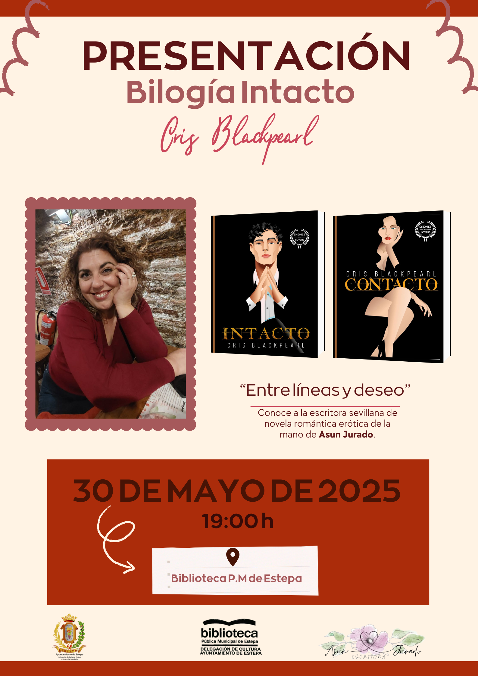 Desde la Delegación de Cultura-Biblioteca PM de Estepa, se va a realizar la Presentación de la Bilogía Intacto, saga compuesta por dos libros "INTACTO" y "CONTACTO" , escritos por Cris Blackpearl.
