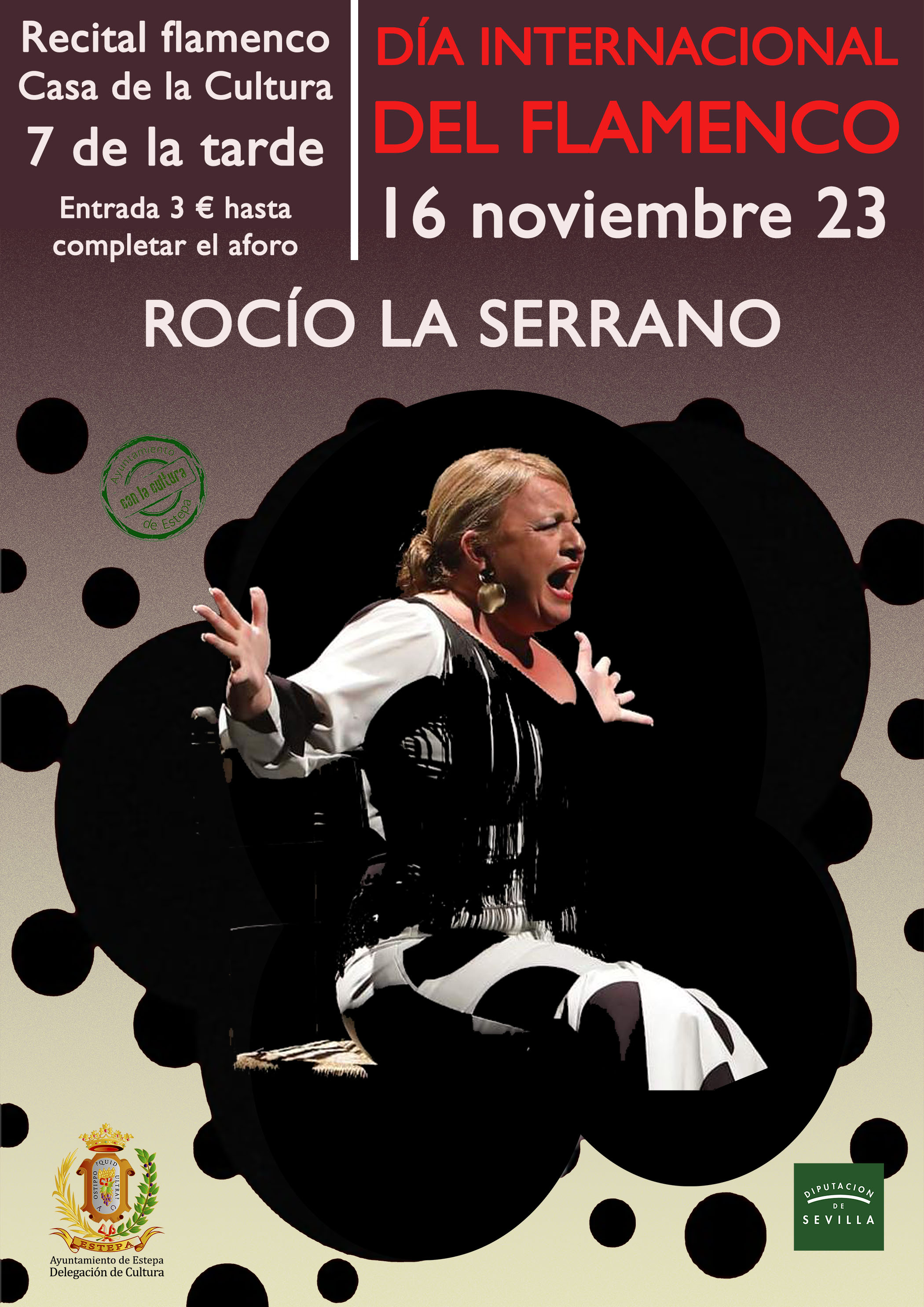 La Delegación de Cultura del Ayuntamiento de Estepa, va a celebrar el día Internacional del Flamenco ofreciendo un recital flamenco de la mano de la cantaora Rocío La Serrano. Sevillana, de sangre trianera, pasó por la escuela de baile de José Galván y pulió su pasión por el cante bajo las batutas de, entre otros, José de la Tomasa y Calixto Sánchez en las aulas de la Fundación Cristina Heeren.