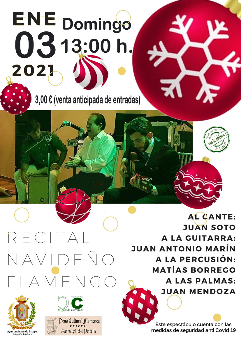 Continuando con nuestro apoyo al flamenco, la Delegación de Cultura organiza en esta ocasión un recital navideño flamenco, contribuyendo así a mitigar las diferentes navidades que nos ha tocado vivir.