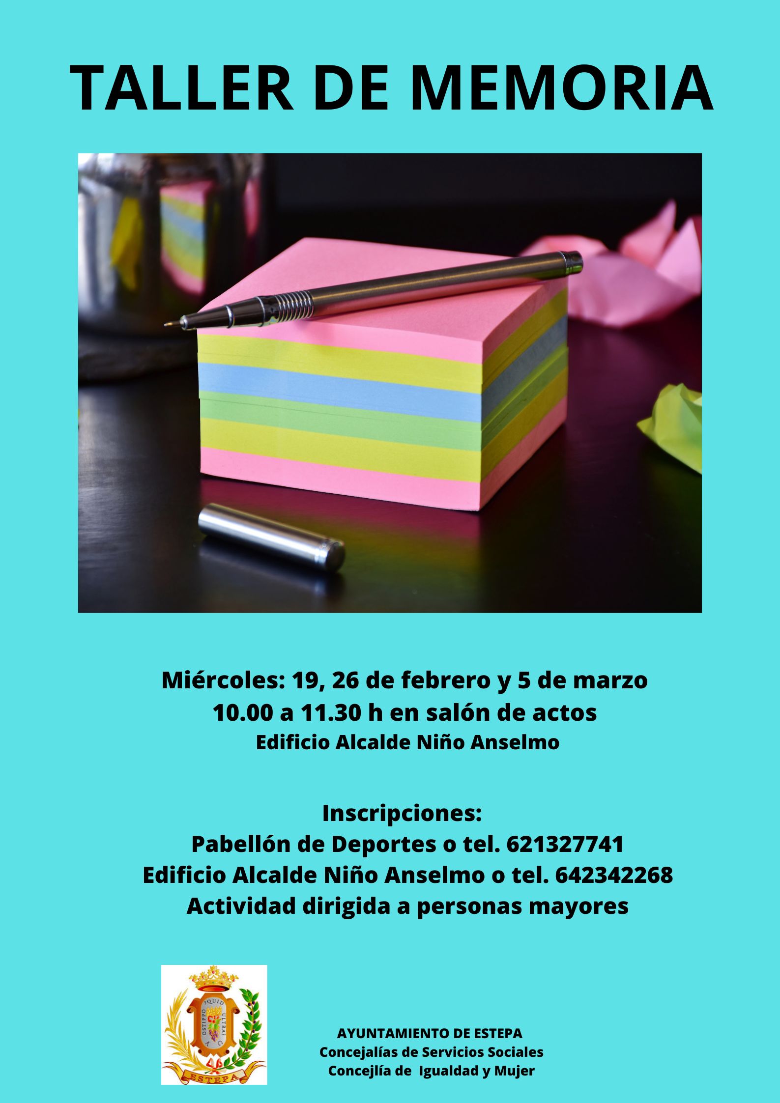 Durante los días 19 , 26 de febrero y 5 de marzo tendrá lugar la actividad Taller de Memoria de 10.00 a 11.30h en salón de actos del Edificio Alcalde Niño Anselmo