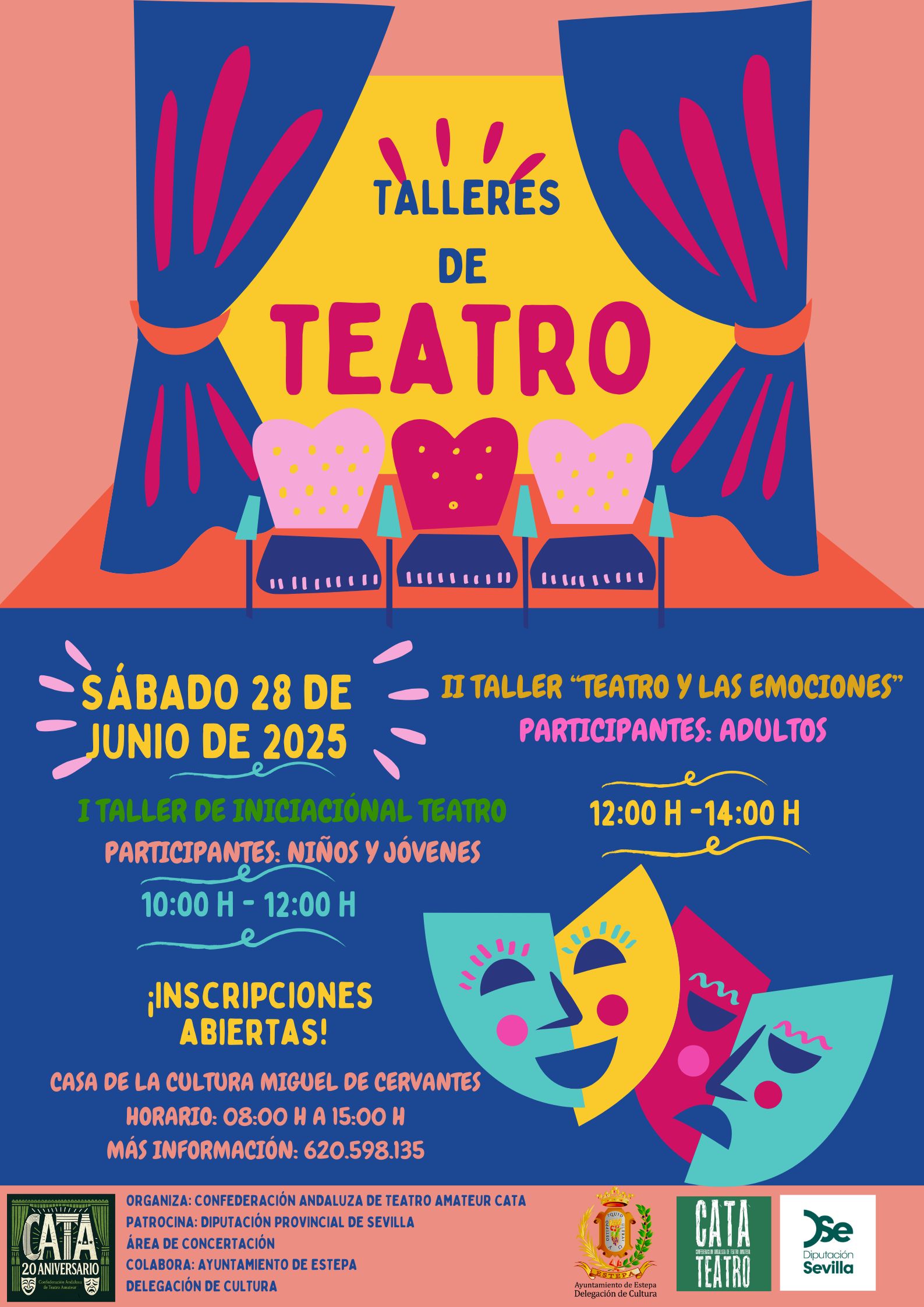 Desde la Delegación de la Cultura os invitamos a participar en los Talleres de Iniciación al Teatro y el de Teatro y Emociones que van a tener lugar este fin de semana en la Casa de Cultura. Os dejamos los enlaces donde os podéis inscribir, las plazas son limitadas.