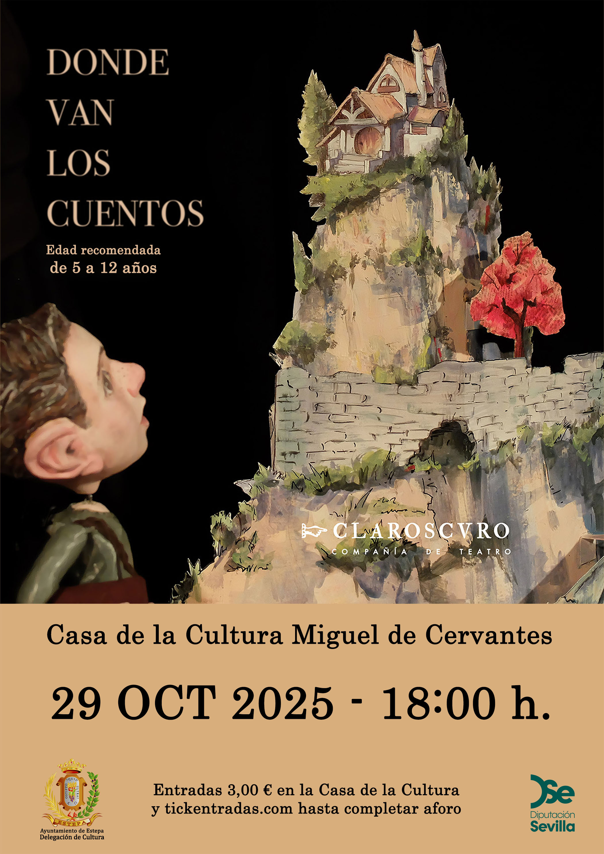 Te esperamos en la Casa de la Cultura. El aforo es limitado, consigue tu entrada en la Casa de la Cultura y en https://www.tickentradas.com/eventos/donde-van-los-cuentos-claroscuro-teatro-estepa-2025
