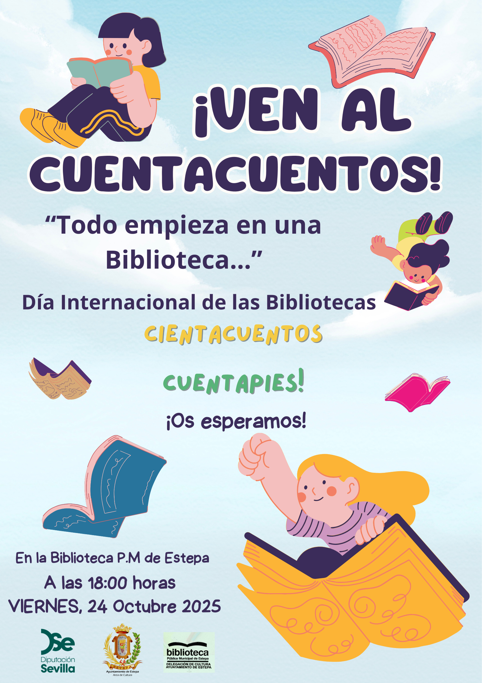 Desde la Delegación de Cultura y dentro del programa de actividades culturales de la Diputación de Sevilla, la Biblioteca P. M. de Estepa, ha organizado una actividad de animación a la lectura a través de diferentes cuentos para celebrar el Día Internacional de las Bibliotecas, con la actuación infantil de Cientacuentos Cuentapies, denominado:“TODO EMPIEZA EN UNA BIBLIOTECA….”