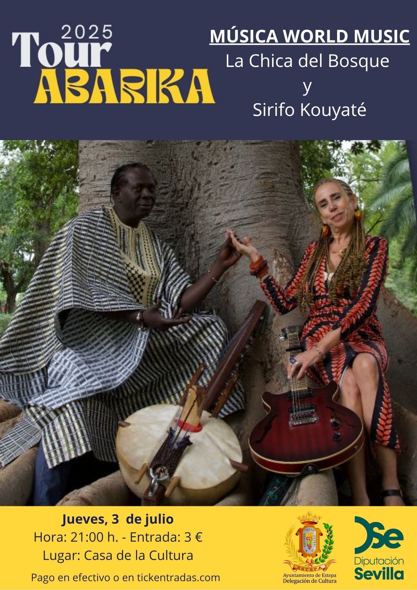 Continuando con el verano cultural, la Delegación de Cultura ofrece un concierto de un dúo internacional de gran trayectoria, fusionando sonidos de África Occidental y Andalucía. Por un lado, Pilar Narbona (La Chica del Bosque) una compositora, cantante e investigadora musical sevillana. Por otro, Sirifo Kouyaté, un virtuoso de la kora, hispano senegalés y descendiente de una de las grandes familias griot de África Occidental. Juntos, presentan ABARIKA, un viaje musical profundo, emotivo y lleno de mestizaje, que celebra lazos entre continentes hermanos.