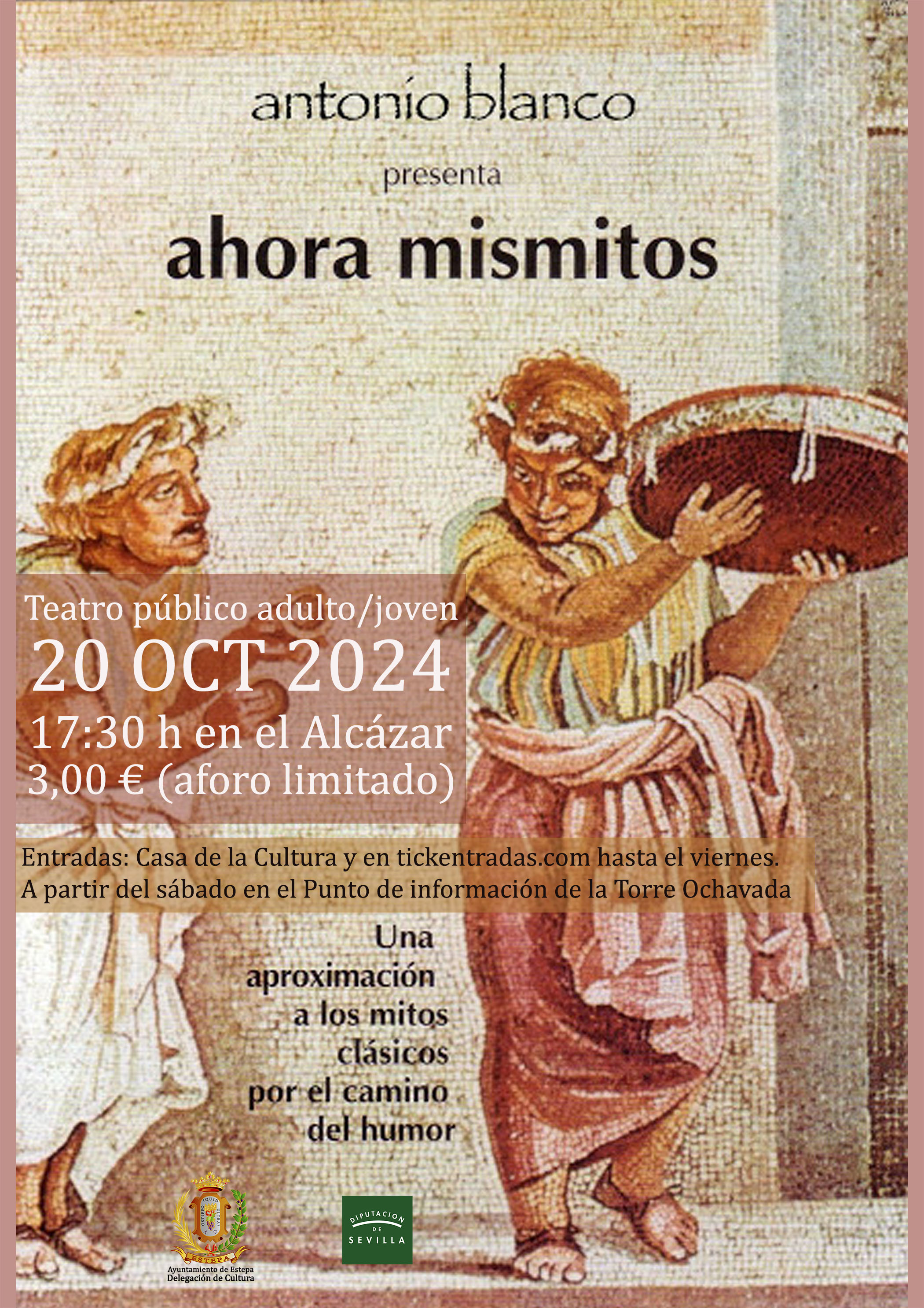 La Delegación de Cultura y dentro de la programación del Mercado Romano que va a tener lugar el próximo fin de semana, ofrece la obra de teatro "AHORA MISMITOS". Dirigida por José Antonio Aguilar e interpretada por Antonio Blanco (Cía. Malaje Sólo). Un divertido acercamiento a la mitología clásica por la senda del HUMOR para público adulto/joven.