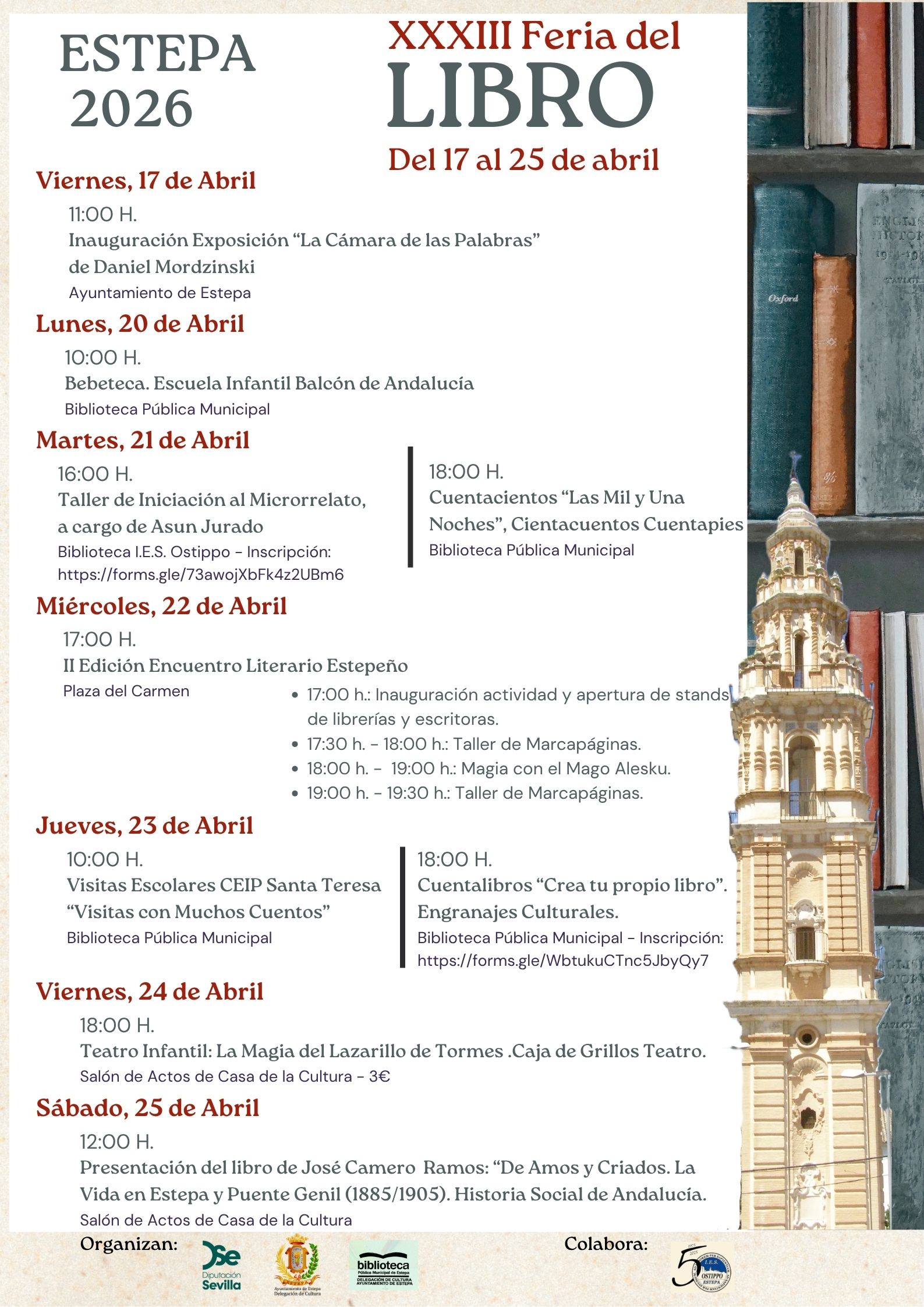 Desde el 17 al 25 de Abril, Estepa celebra su XXXIII Feria del Libro, organizada desde la Delegación de Cultura-Biblioteca. Un año más, hemos programado diferentes actividades: exposición de fotografía, bebeteca, taller de Microrrelatos, cuentacuentos Infantiles, encuentro Literario con librerías y autores, taller de marcapáginas, actuación del Mago Alesku, visitas guiadas a la Biblioteca con cuentos, taller Cuentalibros, teatro infantil, presentación de libro, etc. dirigida a todos los públicos (infantil, juvenil y adulto).