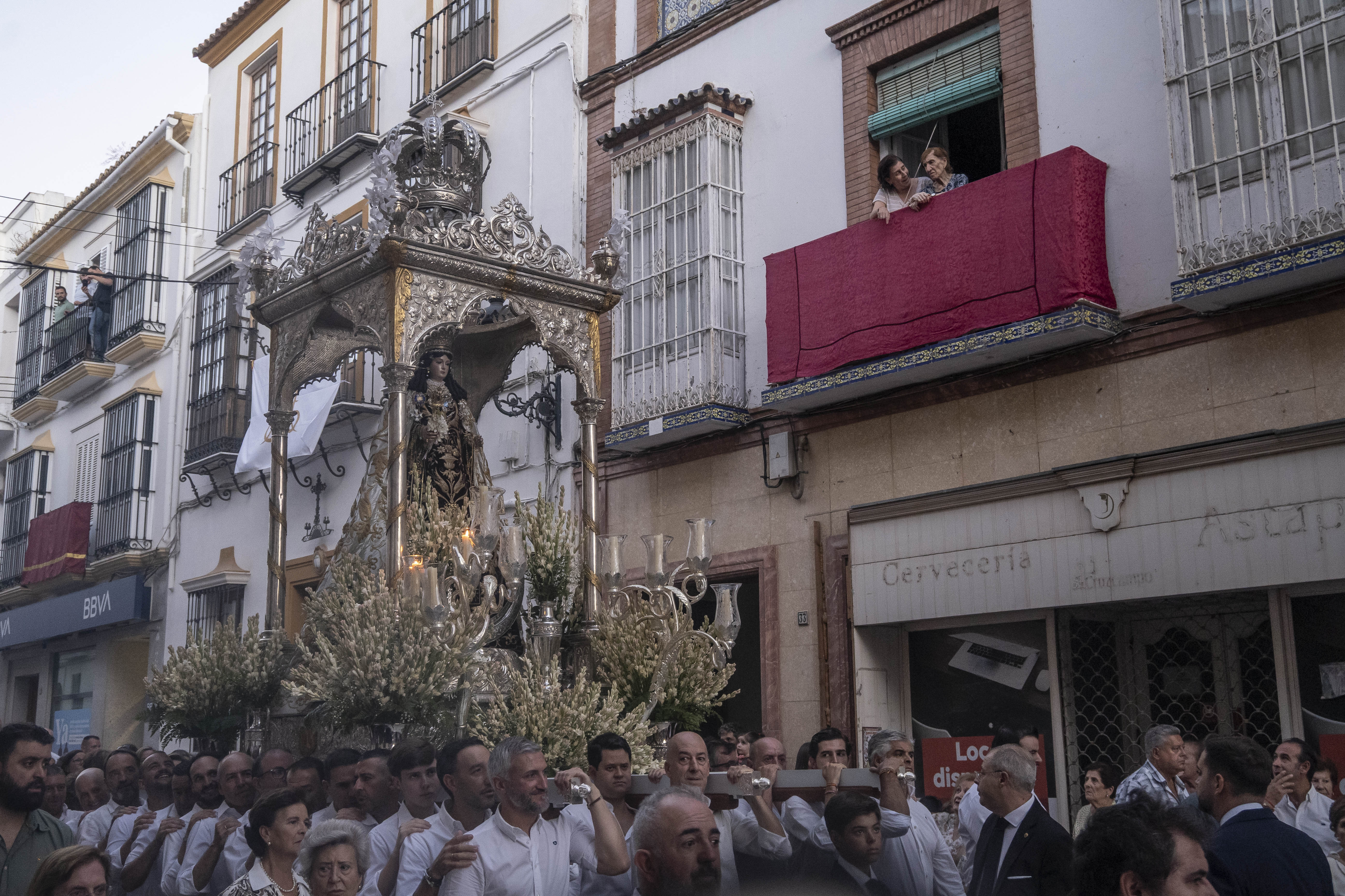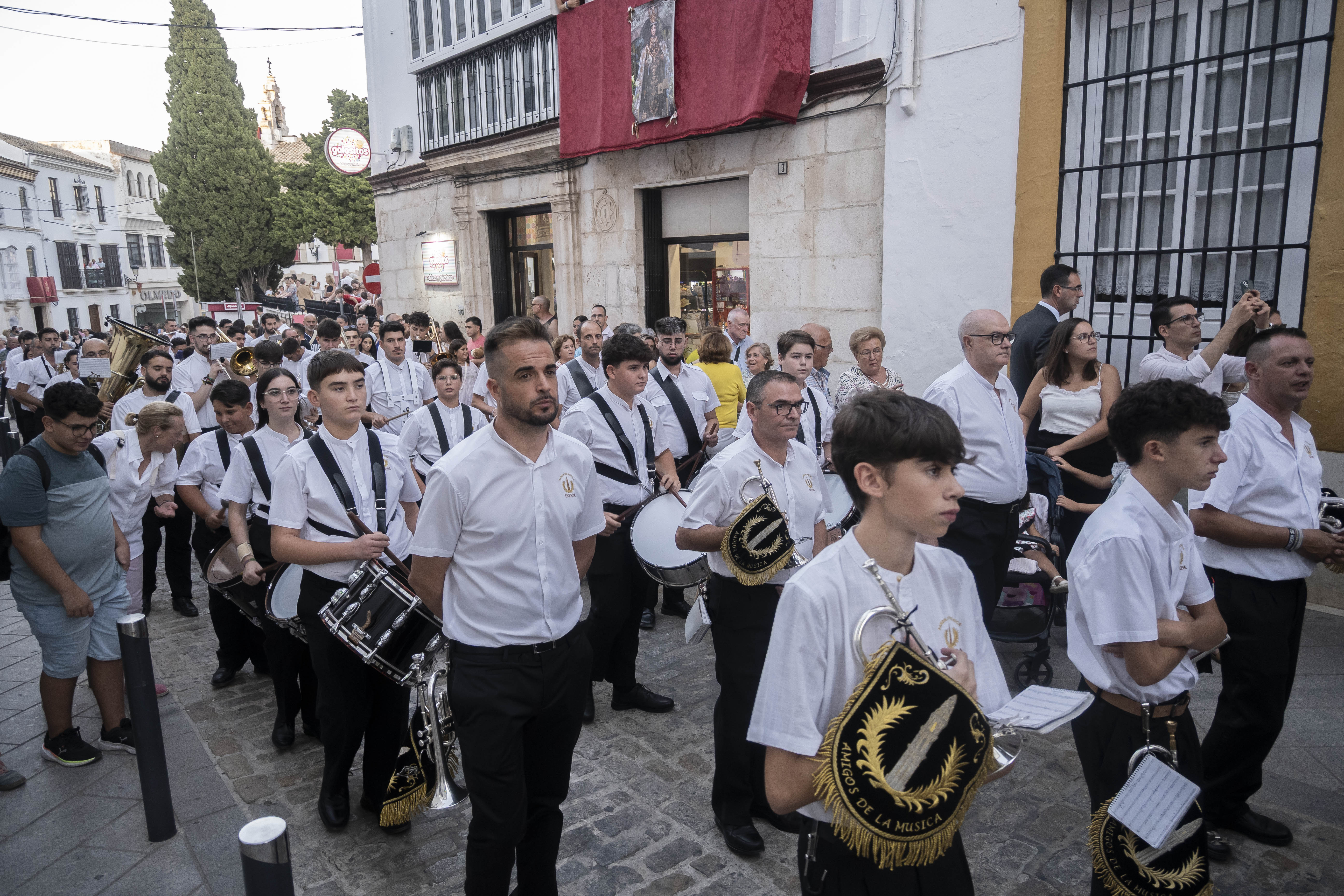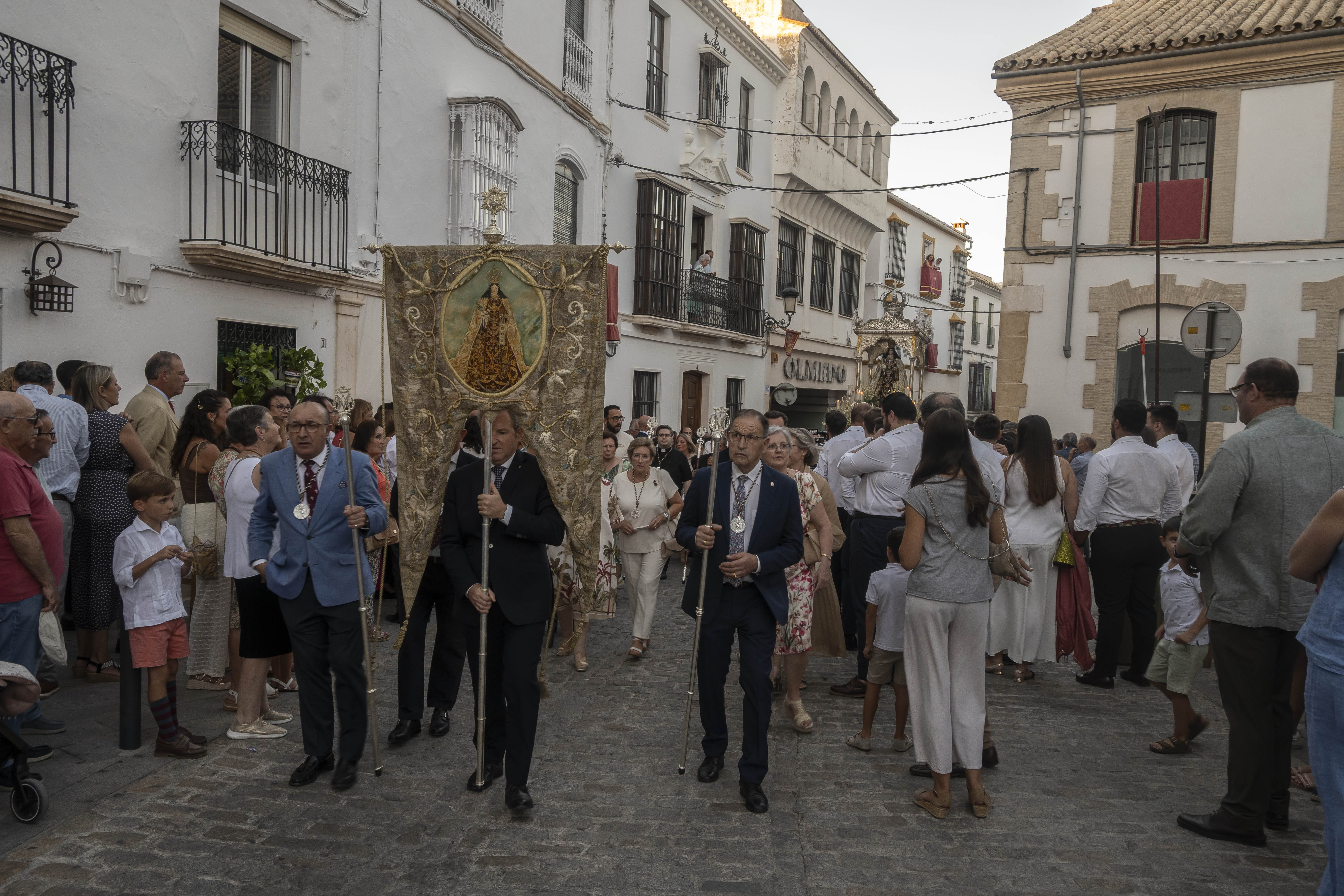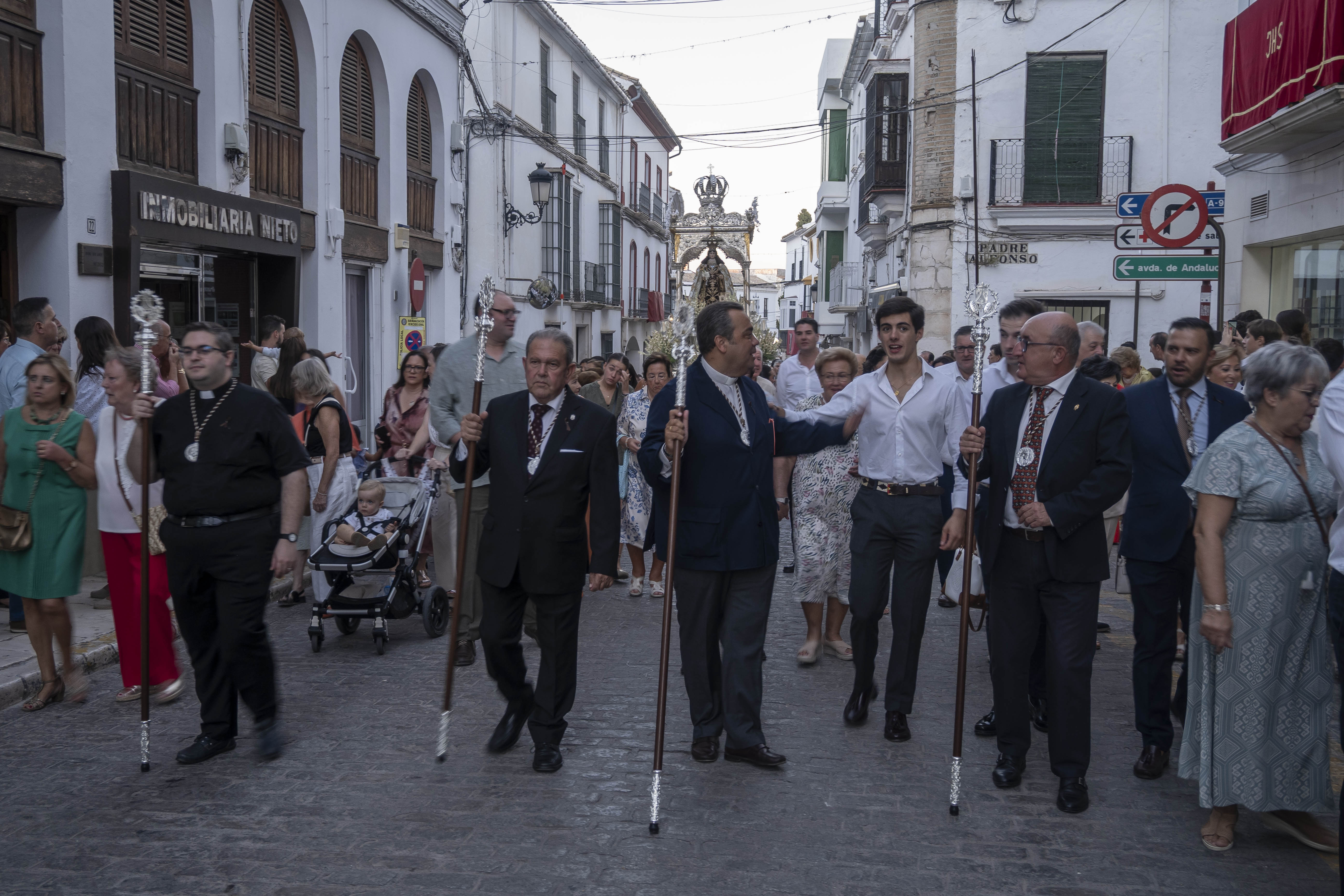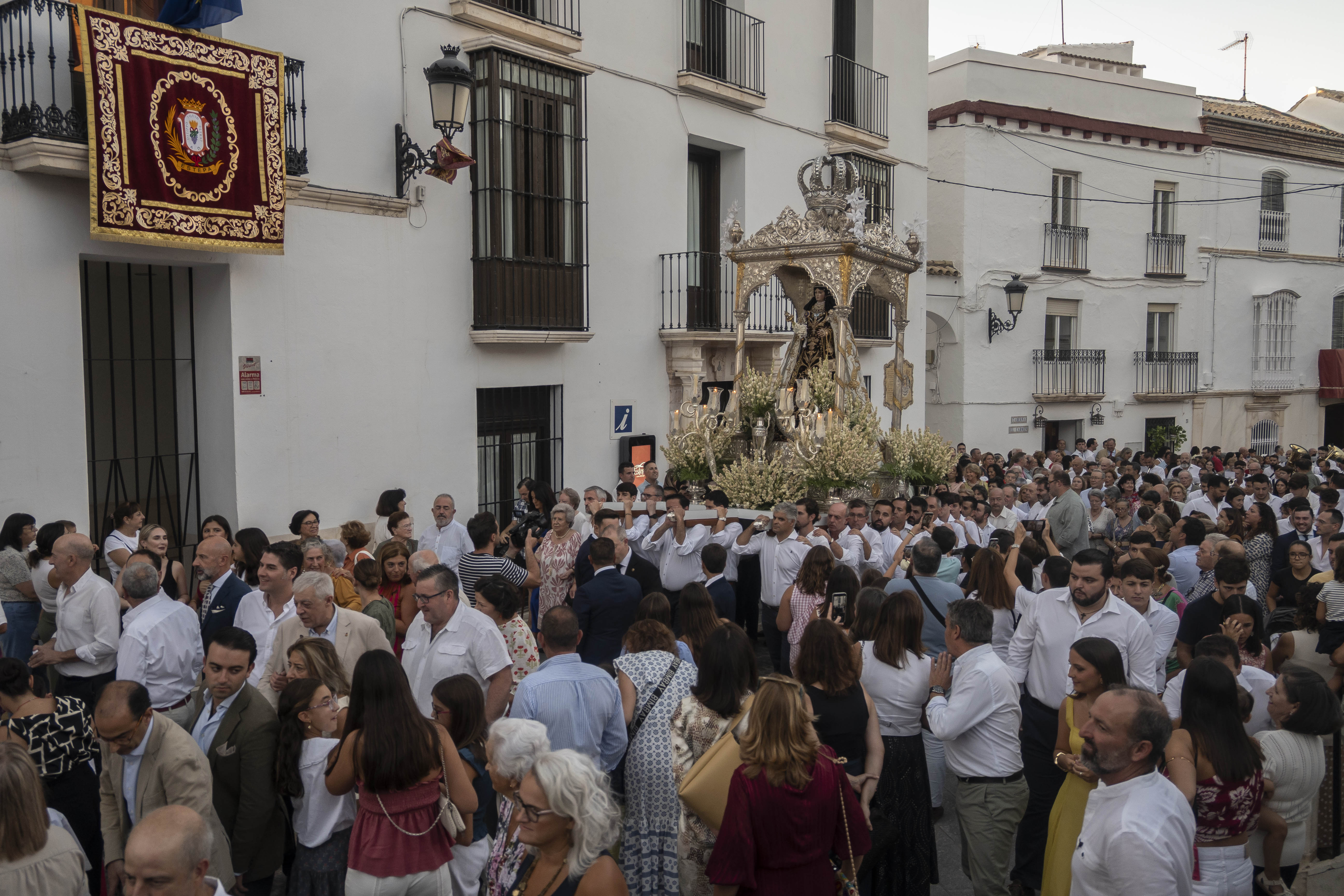 Como siempre, dos cuadrillas de estepeños, uniformados con rigurosa camisa blanca, y a la orden de Rafael Pérez Matas, portan las andas de la Virgen.