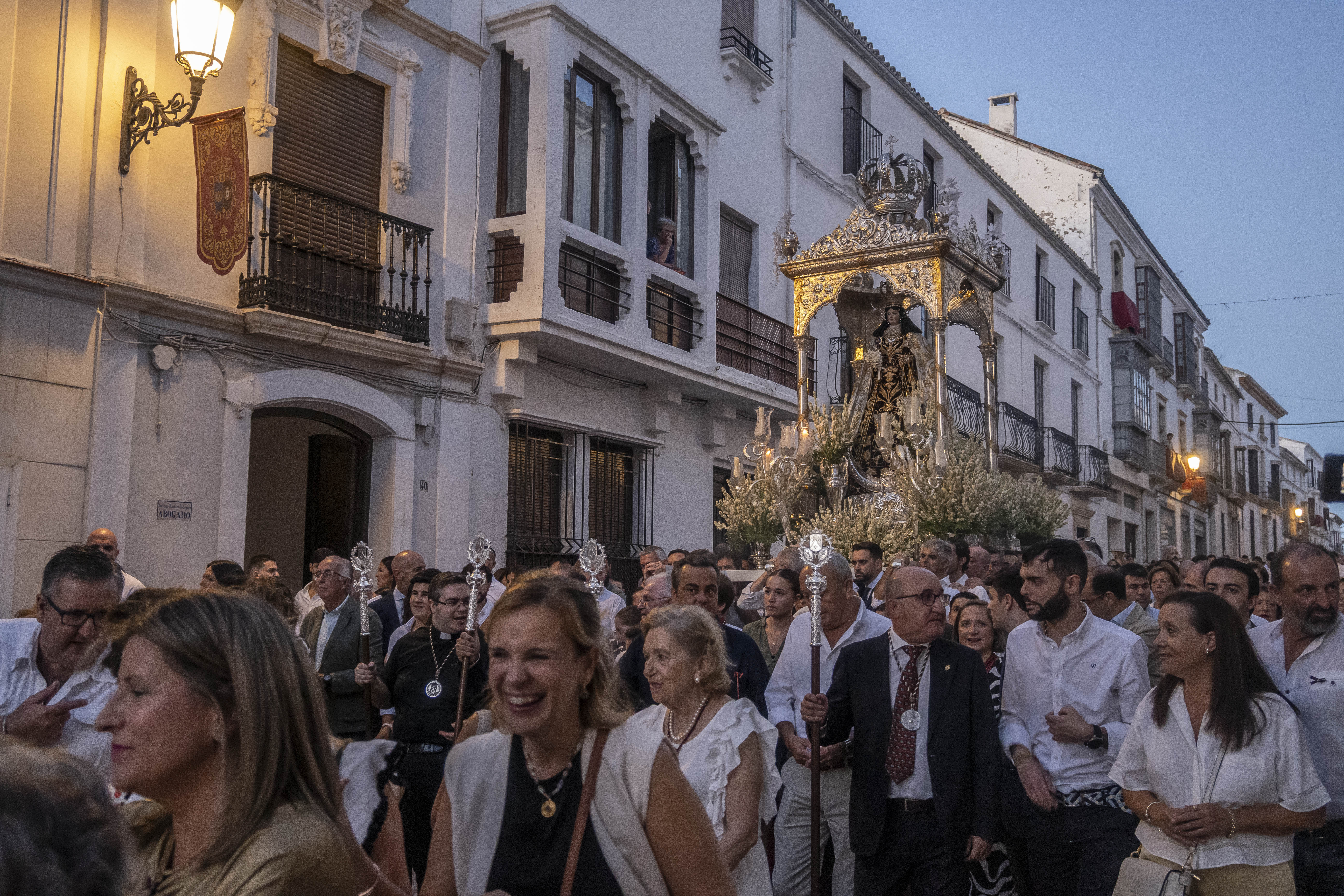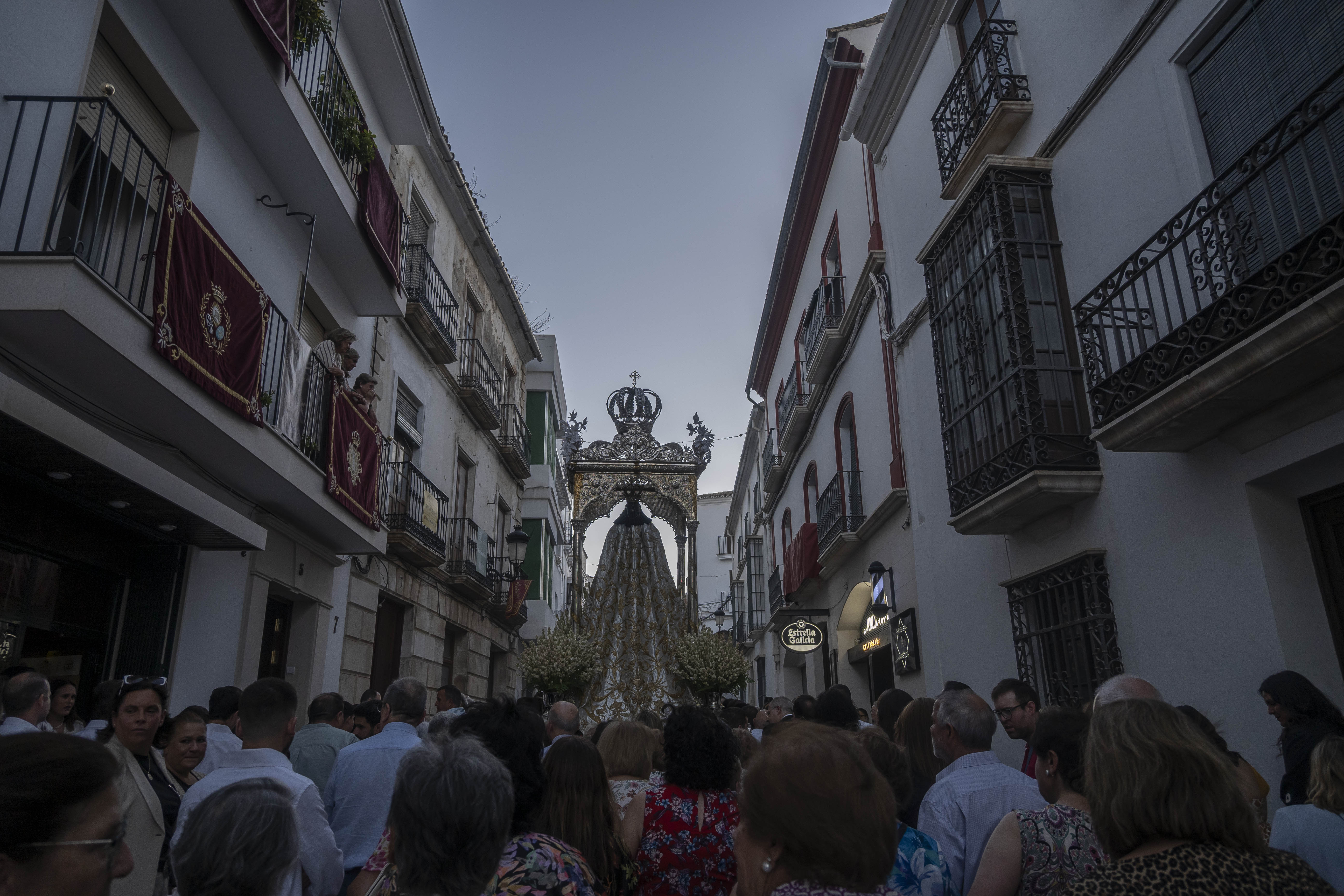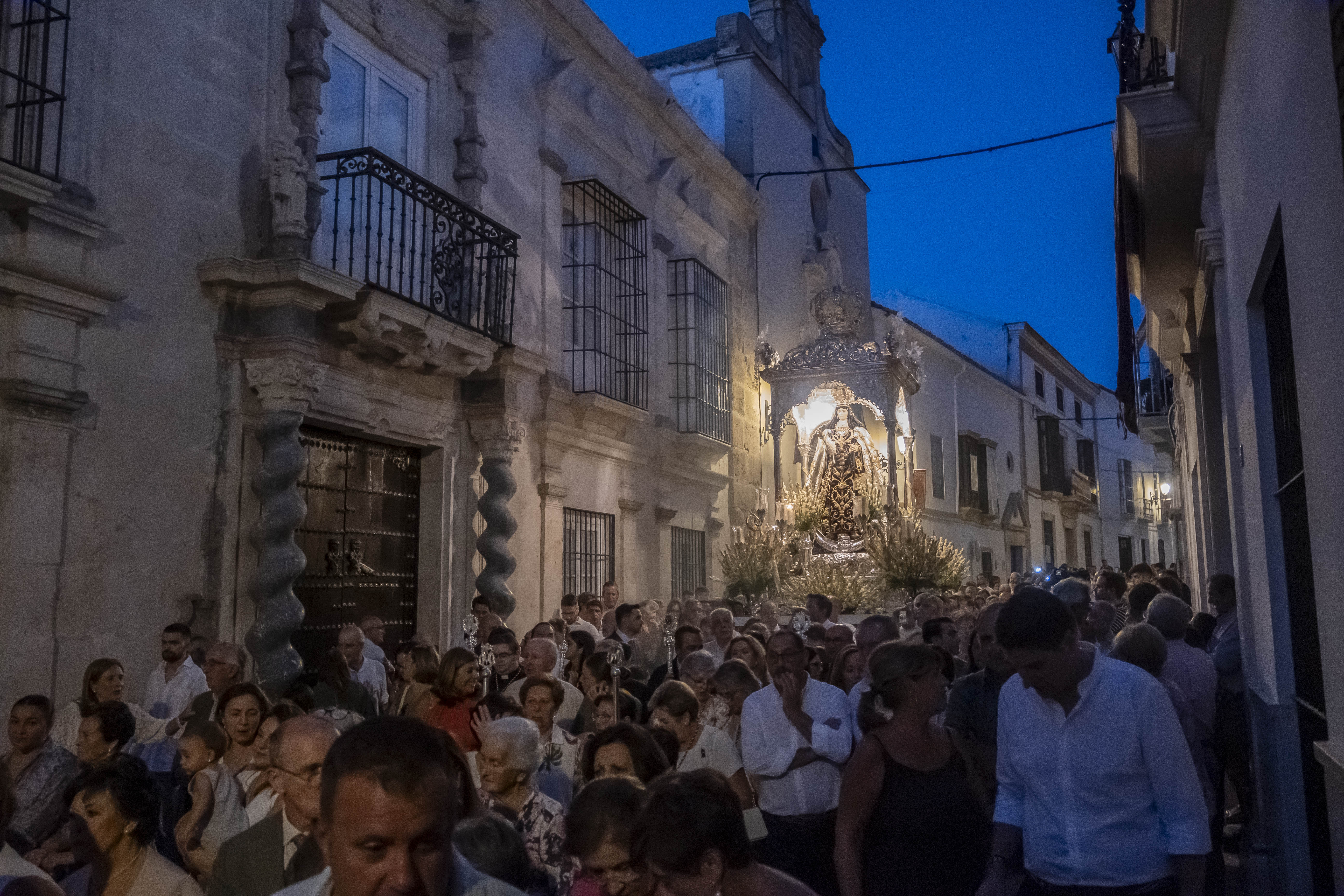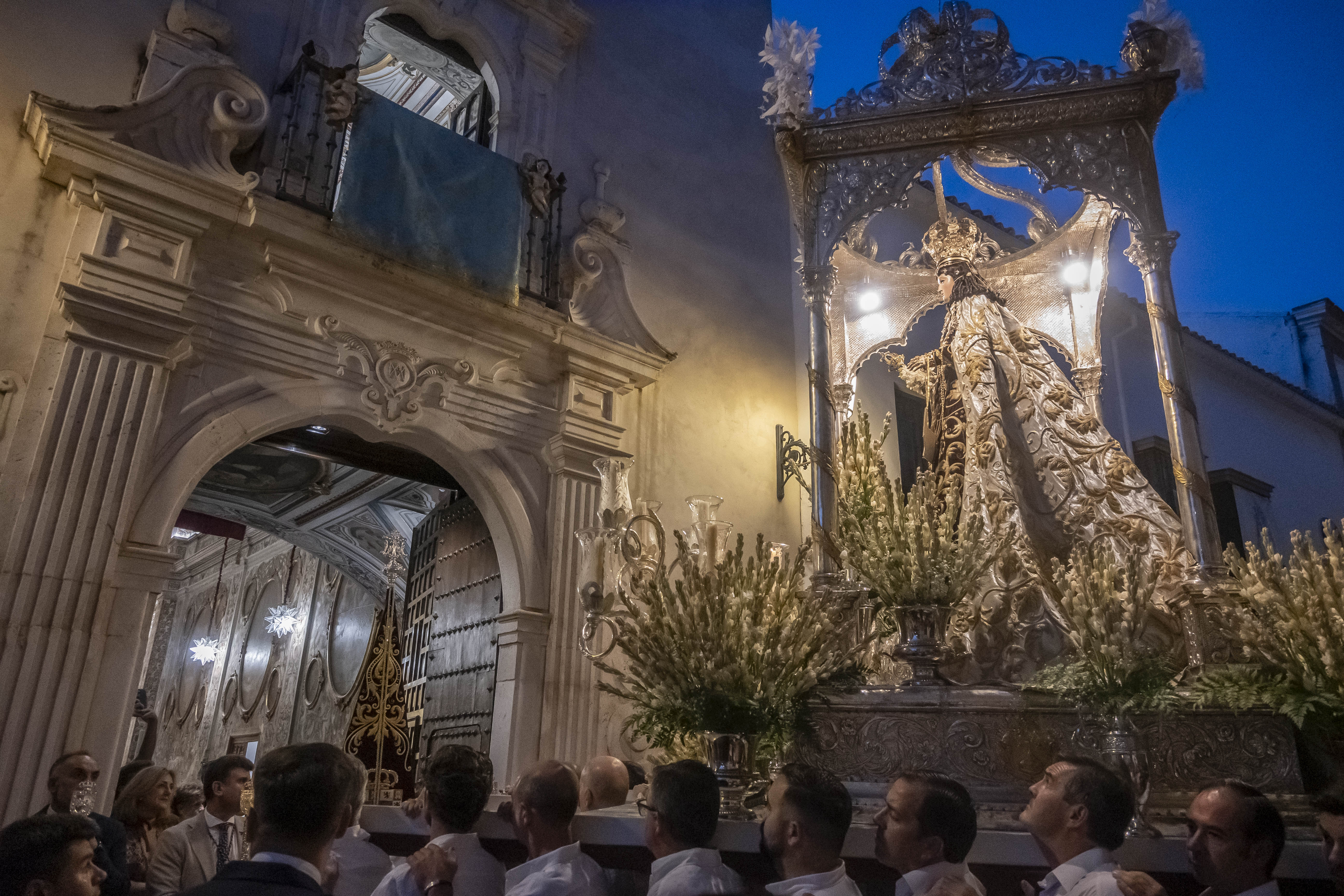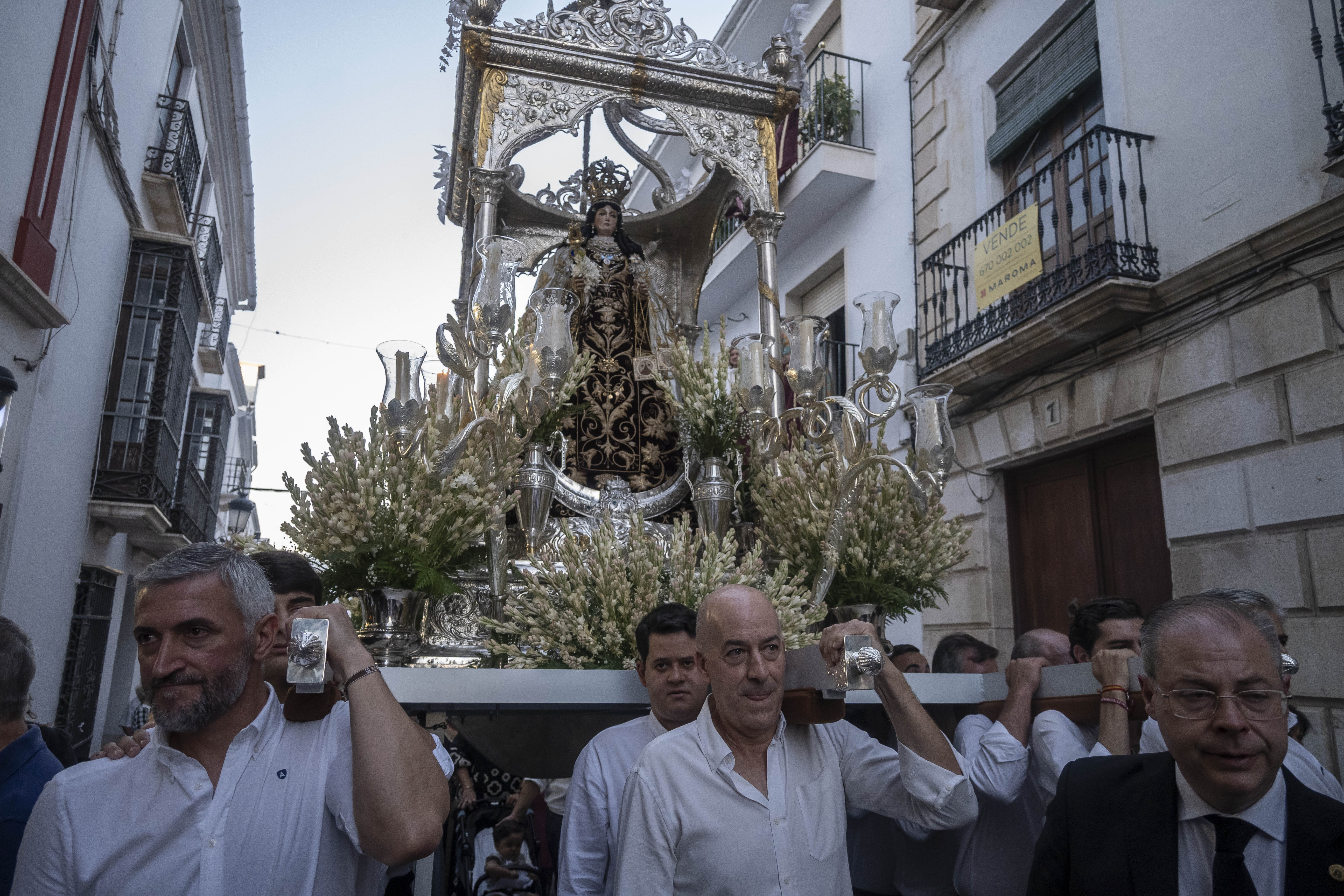 Como siempre, dos cuadrillas de estepeños, uniformados con rigurosa camisa blanca, y a la orden de Rafael Pérez Matas, portan las andas de la Virgen.