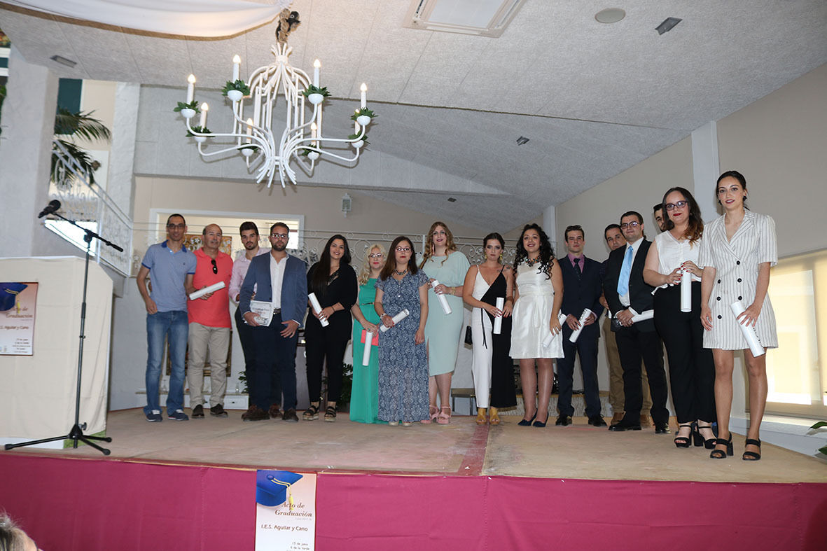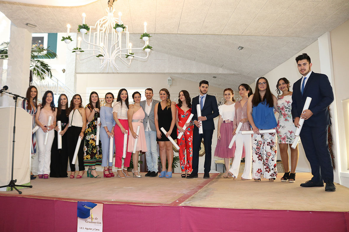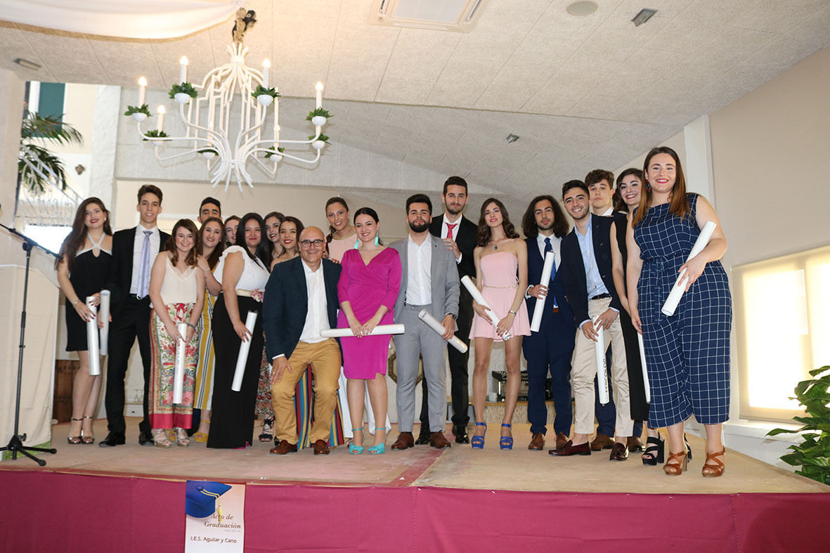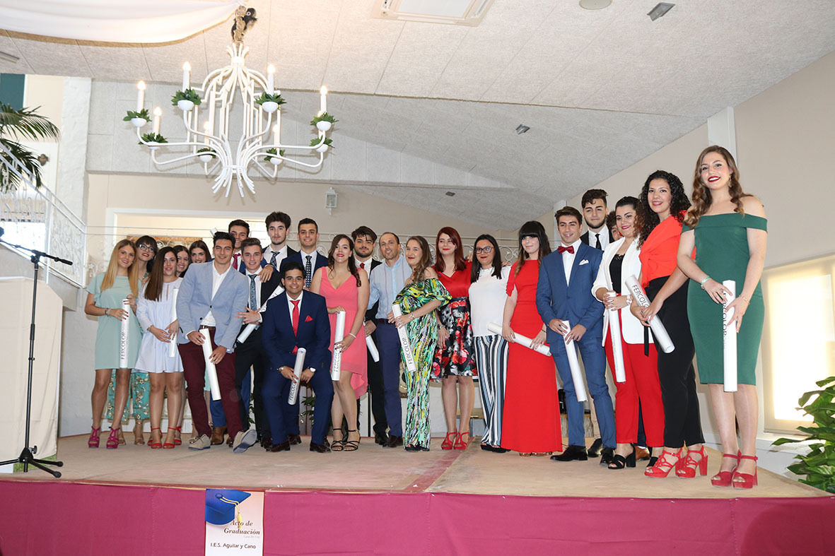 Ayer tuvo lugar el acto de graduación del curso 2017-18 de los alumnos de Bachillerato y Ciclos Formativos del IES Aguilar y Cano. El acto estuvo presidido por el director del centro David Caro y por el alcalde de Estepa Antonio Jesús Muñoz. Además contó con la presencia de la concejala de Educación María Remedios Olmedo y del concejal de Infraestructuras Javier Fernández, que junto con el alcalde hicieron entrega de un premio en metálico que reconoce a los mejores expedientes del curso. El acto se desarrolló en un ambiente muy cordial y satisfacción, tras el final de una etapa para el alumnado, y así lo reconocieron profesores y alumnos que hablaron al público asistente. En representación de los padres y madres de los alumnos y alumnas habló Asunción Pérez Pozo. Finalmente todos los grupos posaron para la foto tras recibir sus orlas.