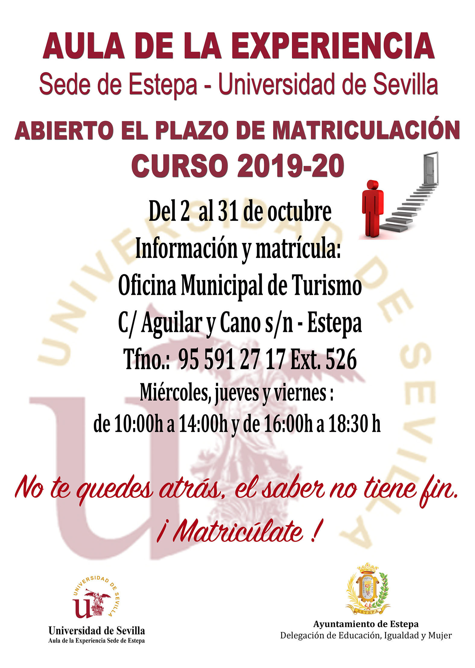 ¿ERES MAYOR DE 55 AÑOS? ¿QUIERES VOLVER A APRENDER?YA PUEDES INSCRIBIRTE EN EL AULA DE LA EXPERIENCIA.¡EL CONOCIMIENTO TE HARÁ LIBRE!Desde el 2 al 31 de octubreEn la oficina de Turismo (C/Aguilar y Cano) Edificio Ayuntamiento